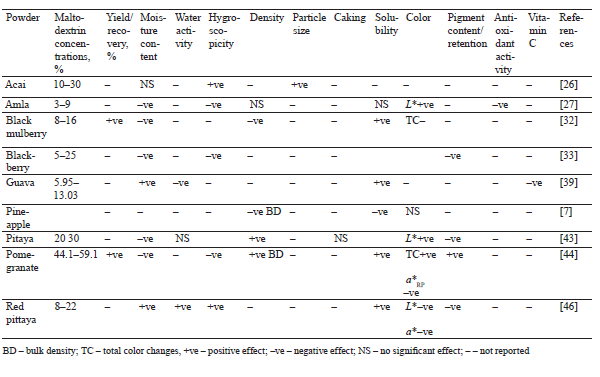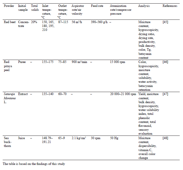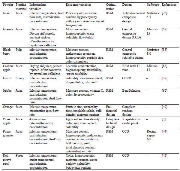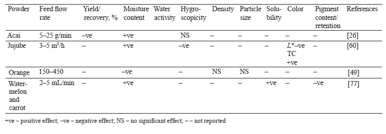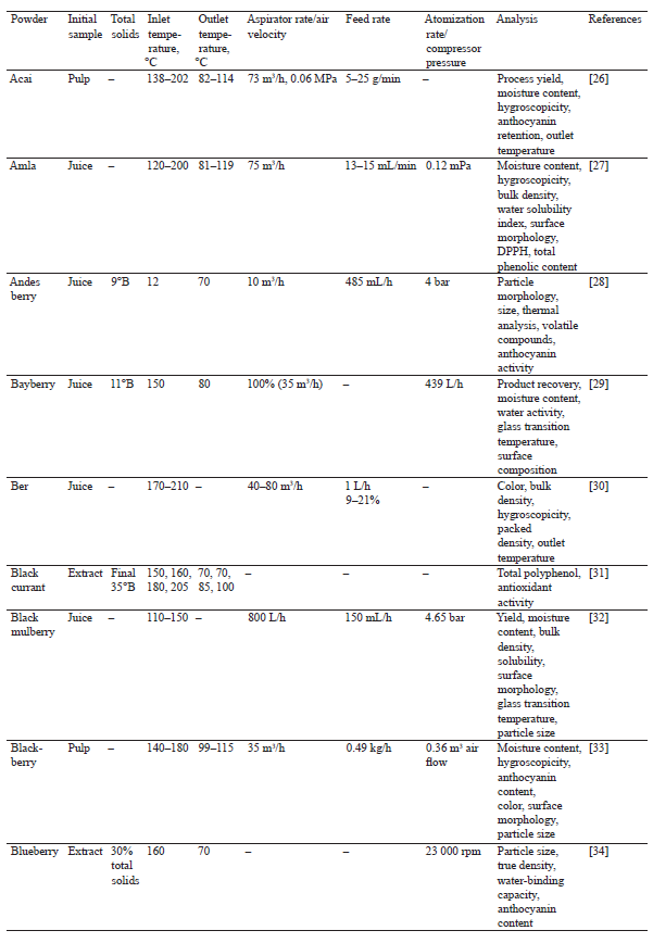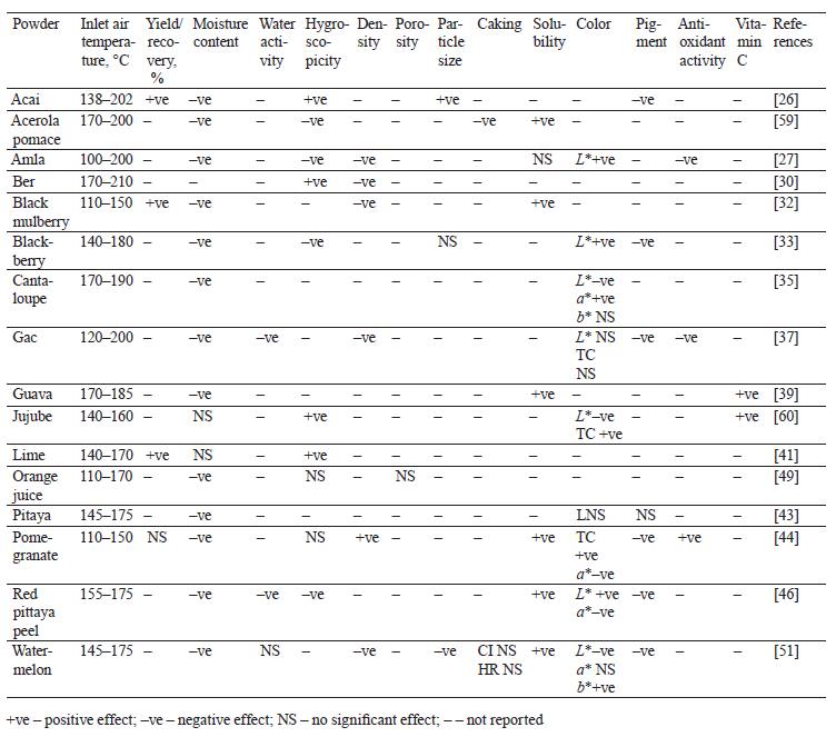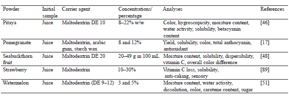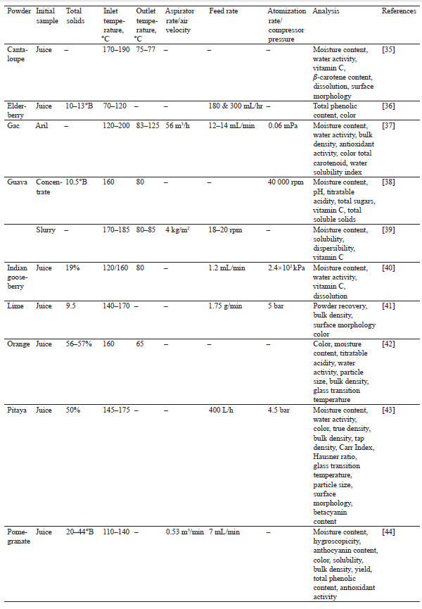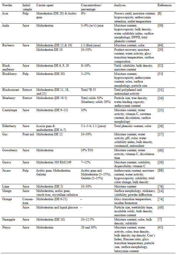 This review features different powdered fruits with optimal storage stability and physiochemical parameters. Spray-drying parameters, such as temperatures and flow rate, can affect the physical properties of powders. Carrier agents provide powders with various favorable qualities, e.g. good flow rate. Commercial spray-drying of fruit juice knows different carrier agents.