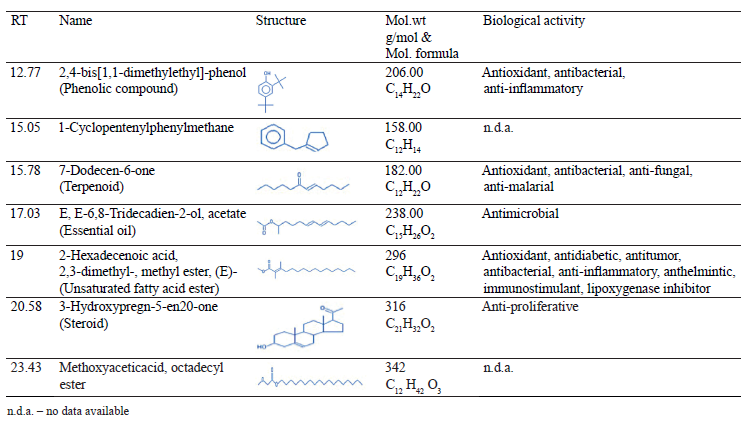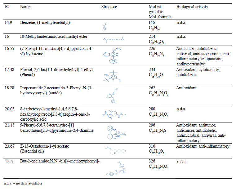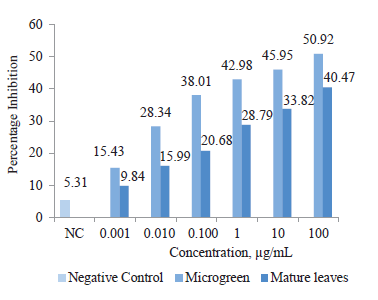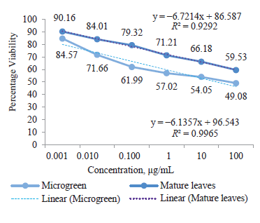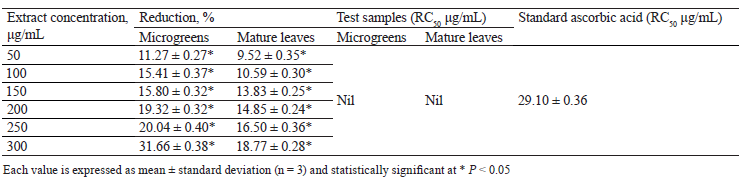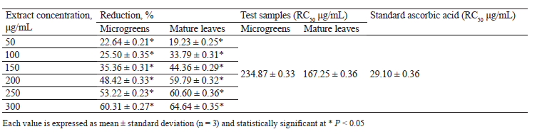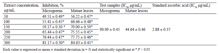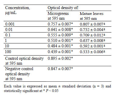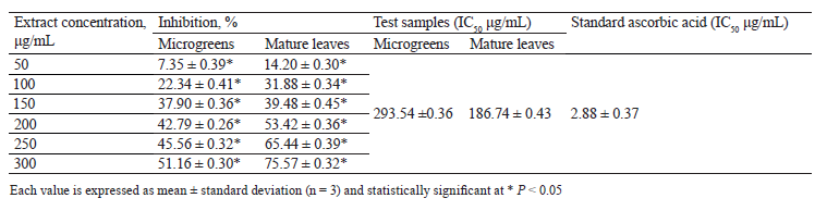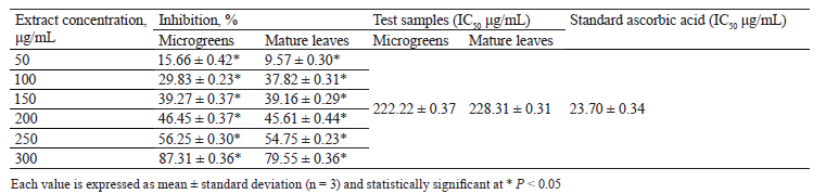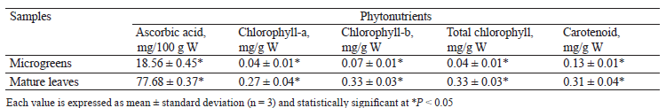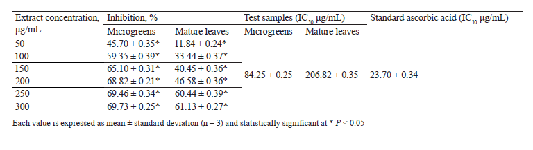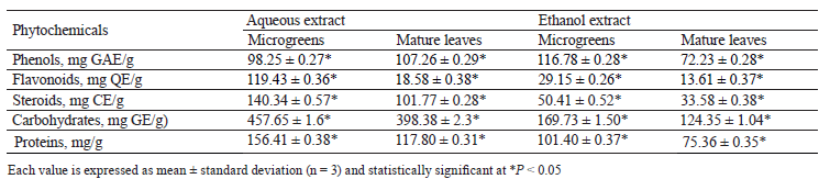 The screening test inferred the presence of alkaloids, terpenoids, glycosides, steroids, tannins, flavonoids, phenols, carbohydrates, and proteins in both microgreens and mature leaves. The quantitative analysis showed that the ethanolic extract of the microgreen sample exhibited higher total phenols. Total flavonoids, steroids, carbohydrates, and proteins were higher both in microgreen extracts, if compared with those of mature leaves. Ascorbic acid, chlorophyll-a, chlorophyll-b, and carotenoids demonstrated a more substantial presence in mature leaves. The gas chromatography-mass spectrometry (GC/MS) analysis of coriander microgreens revealed such bioactive compounds as thienopyrimidines, phenolic amide, imidazo pyridazine, phenolic constituents, and essential oil. Mature leaves were rich in phenolic compounds, steroids, terpenoids, essential oils, and fatty acid esters. All these substances are known for their therapeutic antioxidant, antidiabetic, and anticarcinogenic properties. The microgreen samples exhibited greater ferric reducing antioxidant power, α-amylase enzyme inhibition, and cytotoxicity activity at a lower concentration of extract than mature leaves.