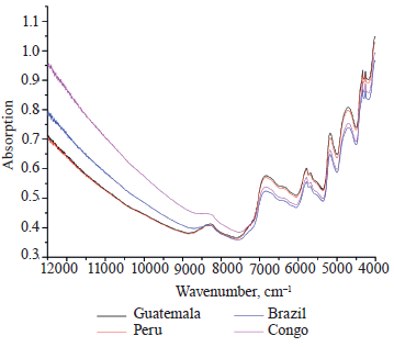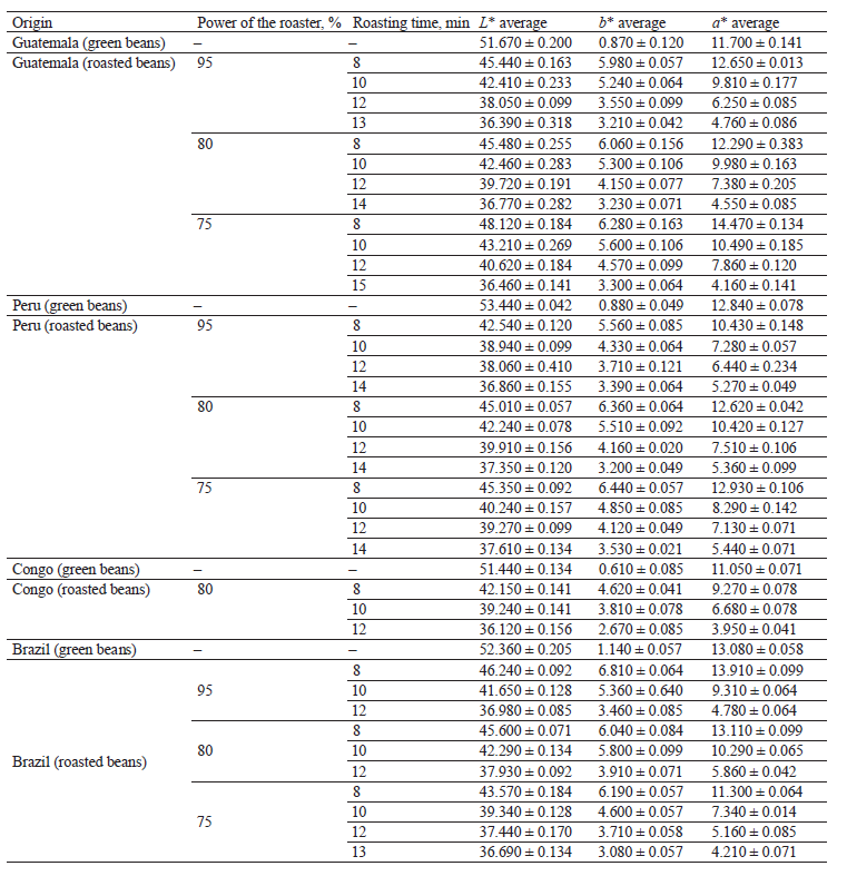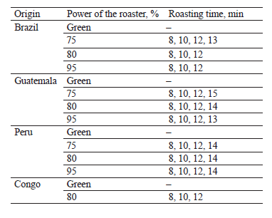 Our study aimed to apply near-infrared spectroscopy to evaluate the quality of coffee samples of different origin (Brazil, Guatemala, Peru, and Kongo). Particularly, we analyzed the roasting time and its effect on the quality of coffee. The colorimetric method determined a relation between the coffee color and the time of roasting. Partial least squares regression analysis assessed a possibility of predicting the roasting conditions from the near-infrared spectra.