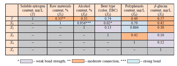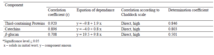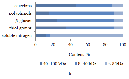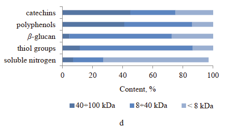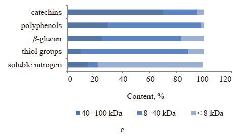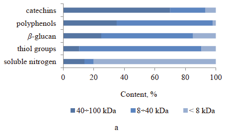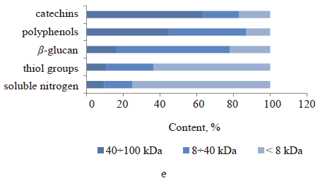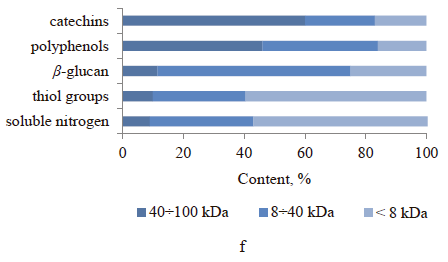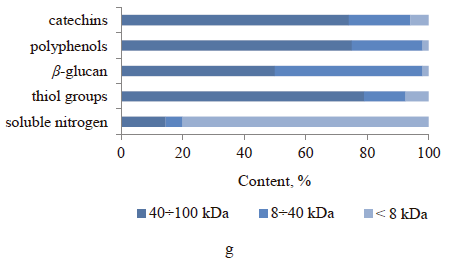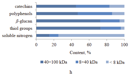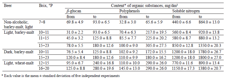 The research established the correlation between the type of grain (barley or wheat malt) and the content of organic compounds, e.g., β-glucan, polyphenols, soluble nitrogen, etc. The research also revealed some patterns in the distribution of proteins, which served as a framework for the system of organic compounds. The distribution of thiol proteins proved to depend on the dissolution degree of the grain and was different in barley light, barley dark, and wheat malt samples. The fraction distribution of β-glucan depended on the color of the malt. In light beer samples, it concentrated in high- and medium-molecular fractions of nitrogenous substances, in dark beer – in low-molecular fractions (≤ 63%). Initial wort density and alcohol content affected the amount of catechins and total polyphenols. Nitrogenous compounds depended on the color, initial extract, and alcohol content.