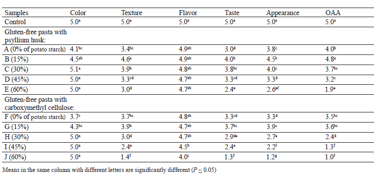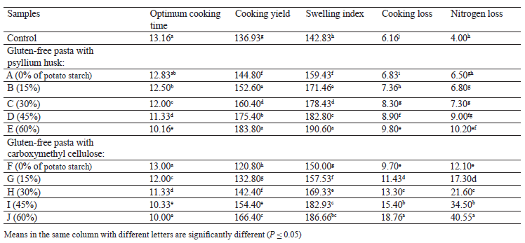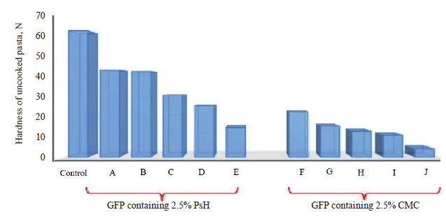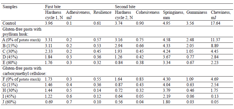 The uncooked gluten-free pasta containing psyllium husk showed significantly higher values of hardness compared to the samples with carboxymethyl cellulose, while the cooked pasta with psyllium husk had a significantly lower nitrogen loss. Also, psyllium husk improved the texture of the cooked gluten-free pasta, providing the highest values of resilience, springiness, and chewiness. Generally, the psyllium husk samples received higher quality values for texture, cooking quality, and sensory parameters, compared to the pasta with carboxymethyl cellulose.