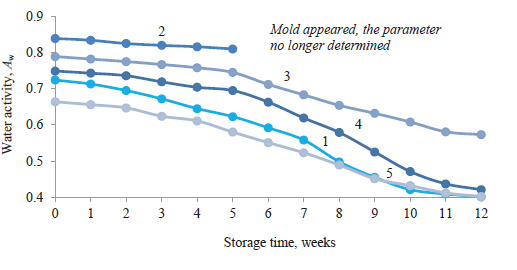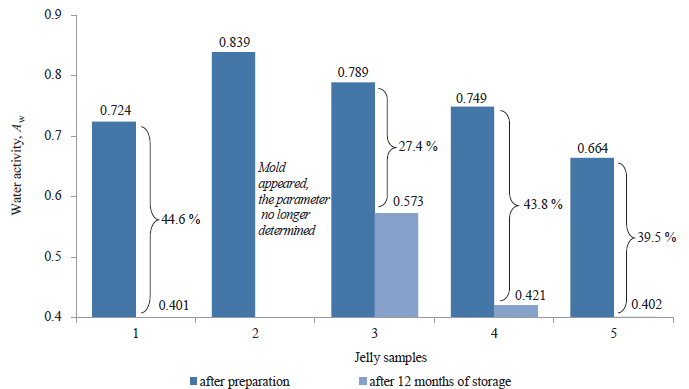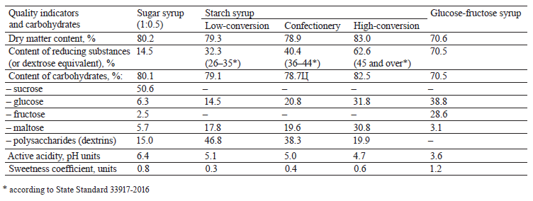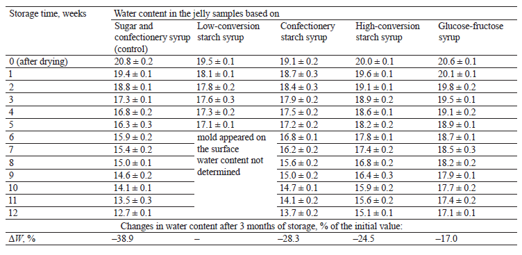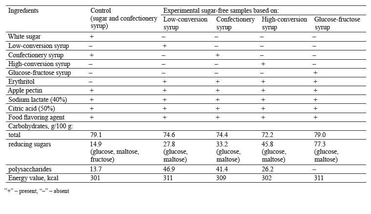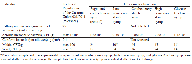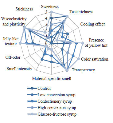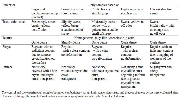 We studied three types of starch syrup (low-conversion, confectionery, high-conversion), glucose-fructose syrup, and sugar-free jelly samples based on them. Jelly based on sugar and confectionery syrup was used as the control sample. The main quality indicators were analyzed against standard values; the sensory parameters were determined by the descriptor-profile analysis; and water activity was measured by using a HygroPalm Rotronic hygrometer. The microbiological safety of the experimental jelly samples was assessed after 12 weeks of their storage in plastic containers.
