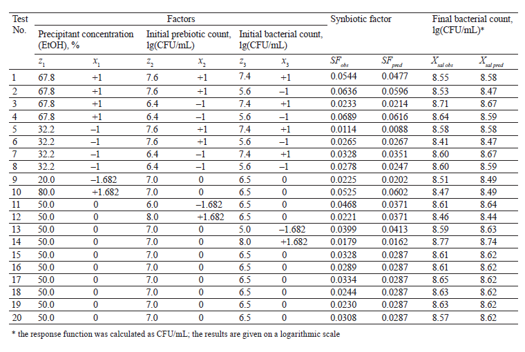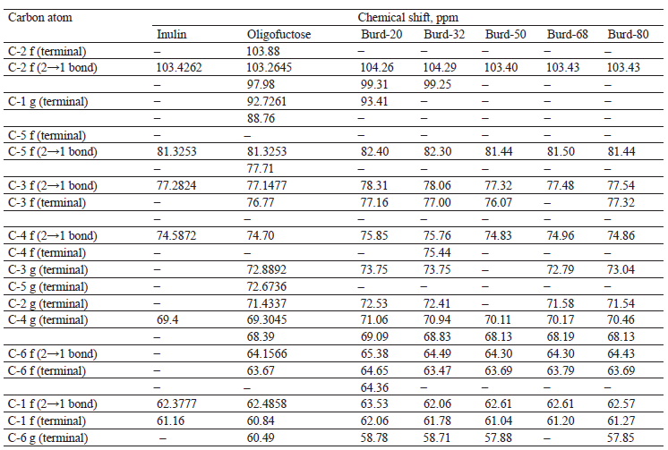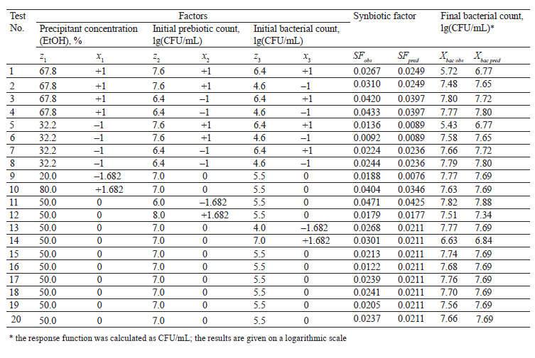 The research involved powdered roots of Arctium lappa L. and strains of Bifidobacterium bifidum, Bacillus cereus, and Salmonella enterica. The experiment was based on the central composite rotatable design. A water extract of A. lappa roots was purified and concentrated. Fructan fractions were precipitated at various concentrations of ethanol, dried, and sub jected to carbon-13 nuclear magnetic resonance (13C-NMR) spectrometry. The bifidobacteria and the test strains were co-cultivated in the same medium that contained one of the fractions. Co-cultivation lasted during 10 h under the same conditions. The acid concentrations were determined by high-performance liquid chromatography to define the synbiotic factor.