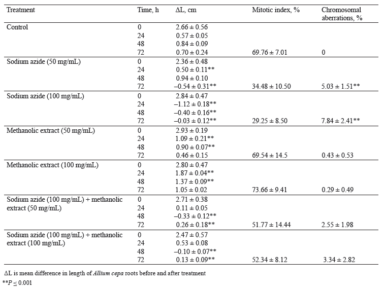 Antiradical scavenging activity was tested by α, α-diphenyl-β-picrylhydrazyl free radical scavenging and β-carotene bleaching method. DNA damage and repair were measured by the Allium cepa test with sodium azide as a mutagenic agent. Mitotic index and chromosomal aberrations were calculated by microscopy of meristem roots stained with 2% carmine acetic.
