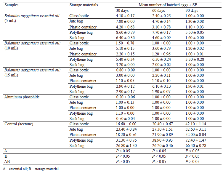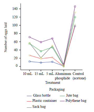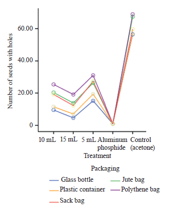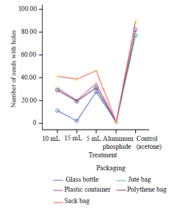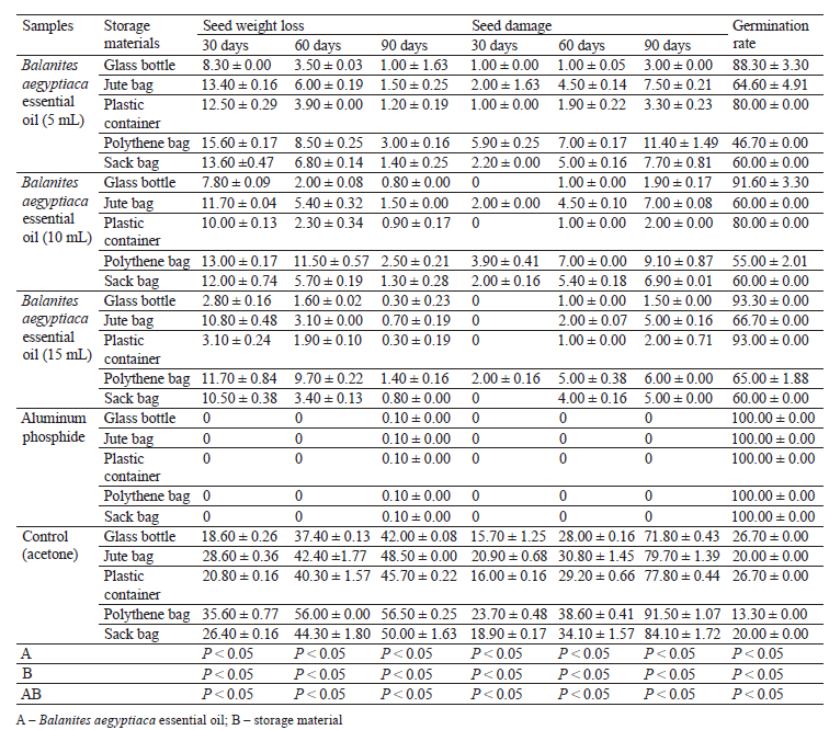 This research quantified weevil proliferation and cowpea seed qualities. The samples were treated with 5, 10, and 15 mL of B. aegyptiaca essential oil diluted in 1 mL of acetone and stored in five storage materials, i.e., jute bags, polythene bags, sacks, plastic containers, and glass bottles. The study featured a completely randomized design with three replications of each treatment: treatment time – 90 days, storage temperature – 30 ± 5°C, check – 0.125 g of aluminum phosphide, control – acetone.
