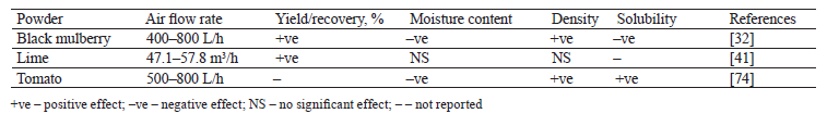 The article introduces the fundamentals of spray-drying and describes the effect of each spray-drying parameter on the powder quality. The list of parameters included inlet air temperature, atomization rate, air flow, and feed flow rate. We also evaluated the impacts of various carrier agents on the powder quality. The article contributed to a better understanding of how variable parameters affect the quality of food powders. The results provide the food industry with better choice options to adopt certain parameters for specific production needs.