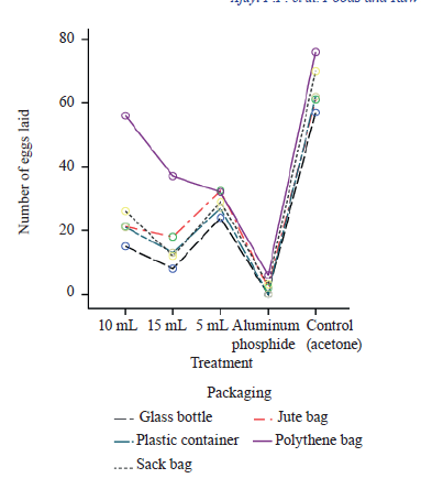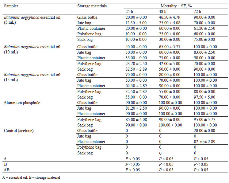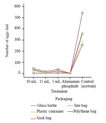 B. aegyptiaca essential oil proved to be an effective insecticide against cowpea weevils. The treatment achieved 100% mortality rate at 10 and 15 mL of B. aegyptiaca essential oil after 72 h of exposure in glass bottles, plastic containers, and jute bags. In addition, B. aegyptiaca essential oil demonstrated a potent activity against oviposition and survival of immature cowpea weevils. Cowpea seeds packaged in glass bottles, plastics containers, and jute bags showed significantly less damage than those stored in sacks and polythene bags. Glass bottles were the best storage material in terms of safety and shelf stability, followed by plastic containers and jute bags.