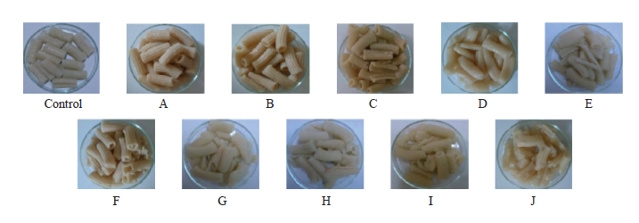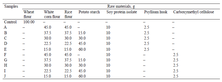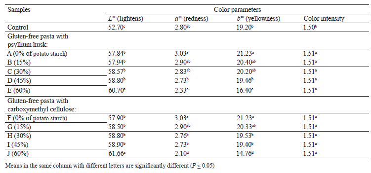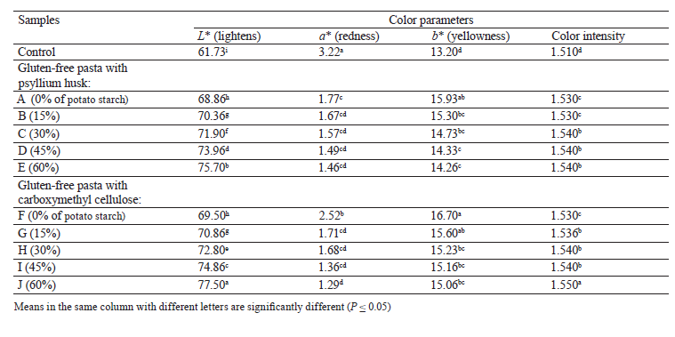 Gluten-free pasta was produced from rice flour, white corn flour, potato starch, soy protein isolate, and carboxymethyl cellulose or psyllium husk used as binding agents. Then, we evaluated the effect of these hydrocolloids on the color, texture, cooking quality, and sensory characteristics of the product.