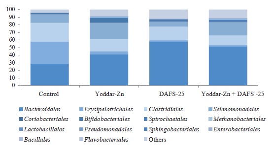 The feed additives increased the population of cellulolytic and lactate-fermenting bacteria, as well as the Prevotella sp. microbiome and bifidobacteria in the rumen samples. The data obtained revealed the effect of essential microelements on the taxonomic pattern of microorganisms and the microflora profile. The research revealed the ratio of normal, opportunistic, pathogenic, nonculturable, and transit microflora. The jejunum wall samples obtained from the experimental group that fed on Yoddar-Zn and DAFS-25 had a more distinct micropicture of mucous membrane. Their rumen microflora balance had fewer pathogenic and opportunistic microorganisms, which was also confirmed by the jejunum morphology.