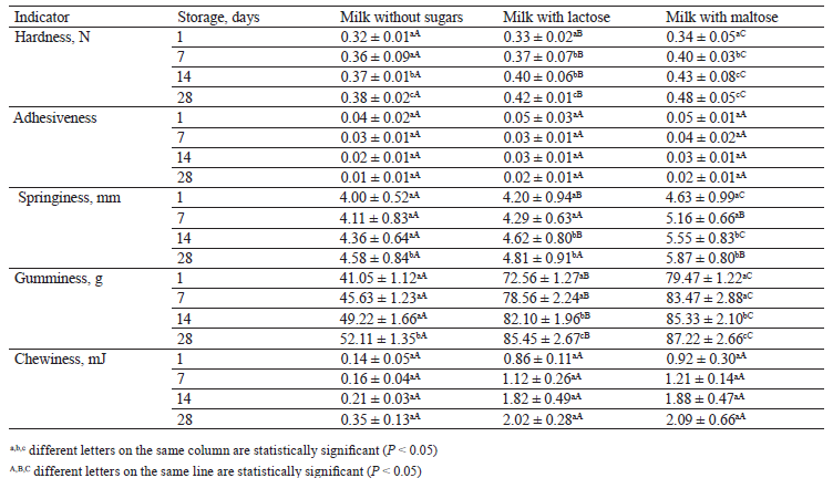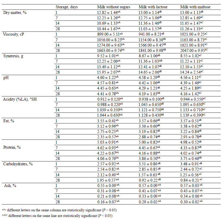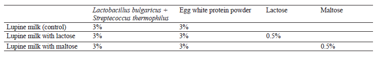 Lupine milk was obtained from lupine seeds, egg white protein powder, disaccharides, and starter cultures were added to the milk to obtain yogurt-like products: samples with maltose, samples with lactose, and samples without sugars. Physico-chemical and microbiological characteristics of the products were determined by the standard techniques. Sensory attributes were evaluated by trained panelists.