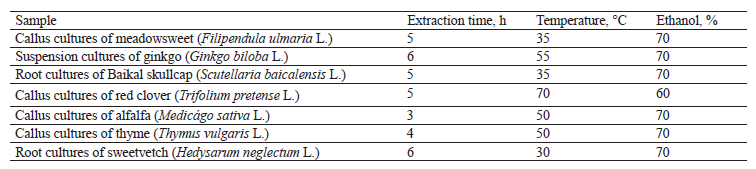High-performance liquid chromatography was applied to isolate bioactive substances from the extracts of callus, suspension, and root cultures of meadowsweet (Filipendula ulmaria L.), ginkgo (Ginkgo biloba L.), Baikal skullcap (Scutellaria baicalensis L.), red clover (Trifolium pretense L.), alfalfa (Medicágo sativa L.), and thyme (Thymus vulgaris L.). Their effect on the lifespan of C. elegans nematodes was determined by counting live nematodes treated with their concentrations of 10, 50, 100, and 200 µmol/L after 61 days of the experiment. The results were recorded using IR spectrometry.