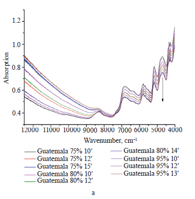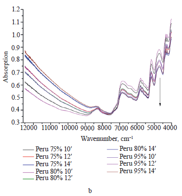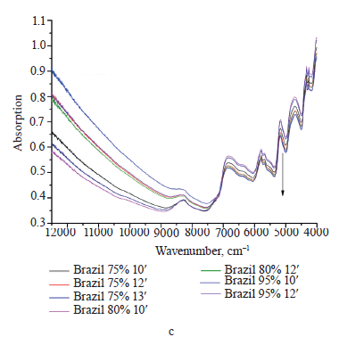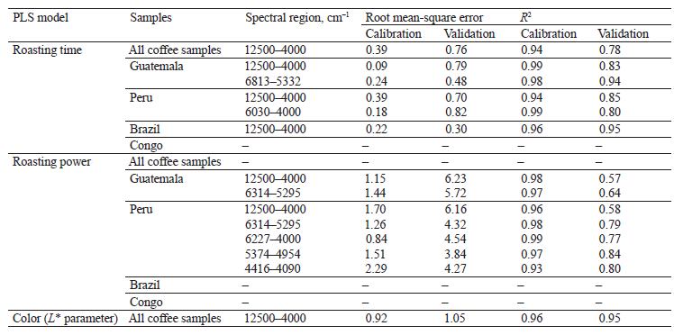 The regression results confirmed the possibility of applying near-infrared spectra to estimate the roasting conditions. The correlation between the spectra and the roasting time had R2 values of 0.96 and 0.95 for calibration and validation, respectively. The root mean square errors of prediction were low – 0.92 and 1.05 for calibration and validation, respectively. We also found a linear relation between the spectra and the roasting power. The quality of the models differed depending on the coffee origin and sub-region. All the coffee samples showed a good correlation between the spectra and the brightness (L* parameter), with R2 values of 0.96 and 0.95 for the calibration and validation curves, respectively.