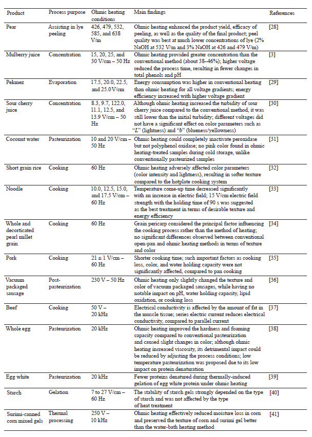 Food processing is an important operation in the food industry that converts fresh foods into final products with desirable characteristics for consumption and storage. Ohmic heating is an emerging technique for food processing that seems to be a suitable alternative to conventional heat treatment. Recently, there has been a lot of research into ohmic heating applications in processing various foods.