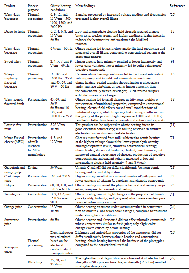 This review highlights the findings of studies conducted in 2018–2022 on the impact of ohmic heating on the physical, chemical, and sensory properties of foodstuffs during processing. We found that this technology provides more reliable process control compared to the traditional technique, namely conventional heating. Although ohmic heating has a positive effect on the quality of foods, its efficiency is limited by certain food components, including acid and fat, that markedly affect the electrochemical attributes of foods.