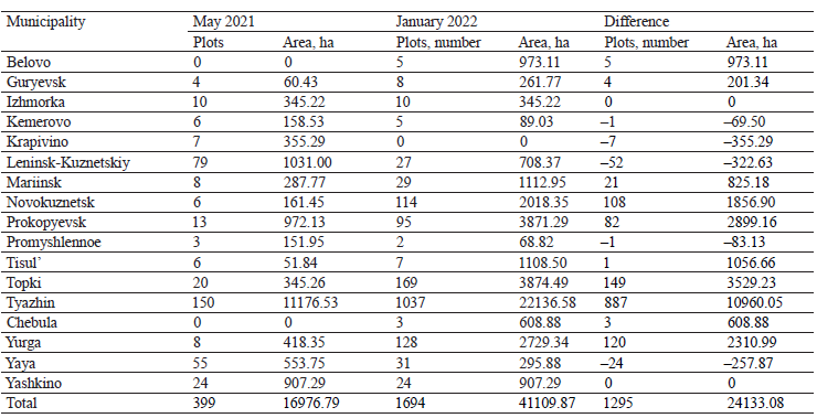 The aerial survey took place in 2021 and involved 17 municipalities of the Kemerovo Region. The software and hardware complex included an unmanned aerial vehicle (UAV) and a module for aerial photography. Photogrammetric, cartometric, and satellite methods were used to define the coordinates of feature points. We developed new software (Sovhoz.avi) to perform the land inventory.