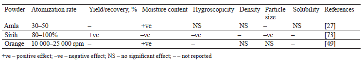 Inlet temperature, maltodextrin concentration, and air flow rate of spray-drying increased the powder yield but decreased the moisture content. Inlet temperature, maltodextrin concentration, and feed flow rate affected the solubility. Effects of atomization rate, air flow rate and free flow rate were assessed in terms of yield, moisture content, hygroscopicity, and solubility.