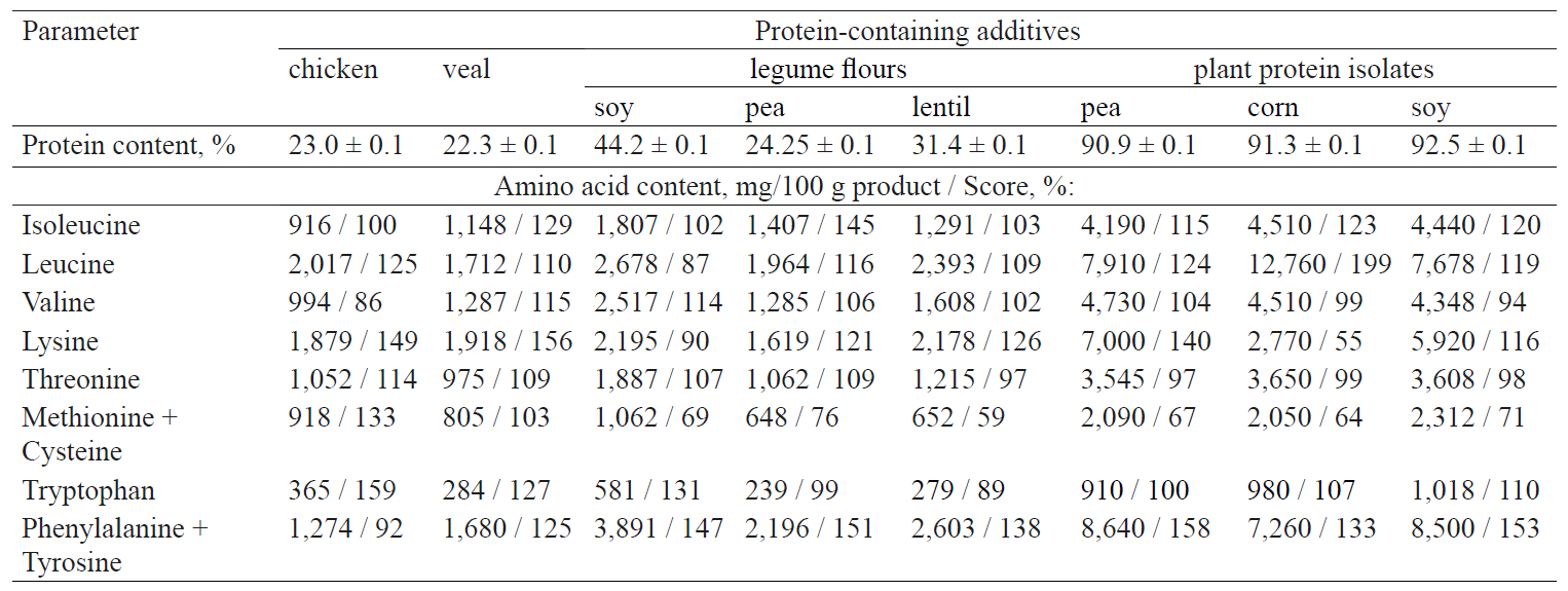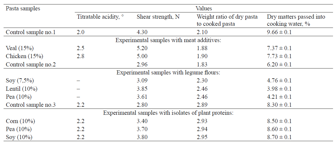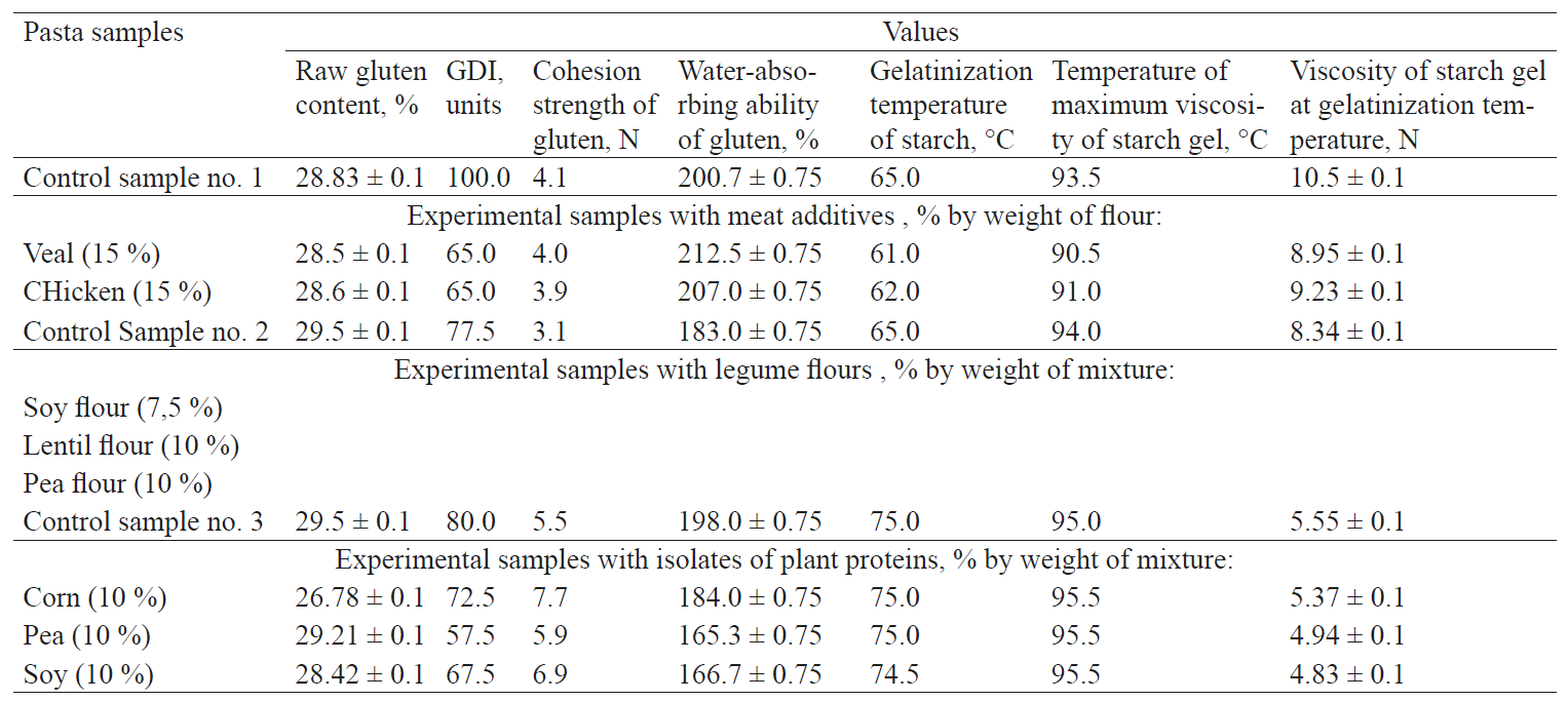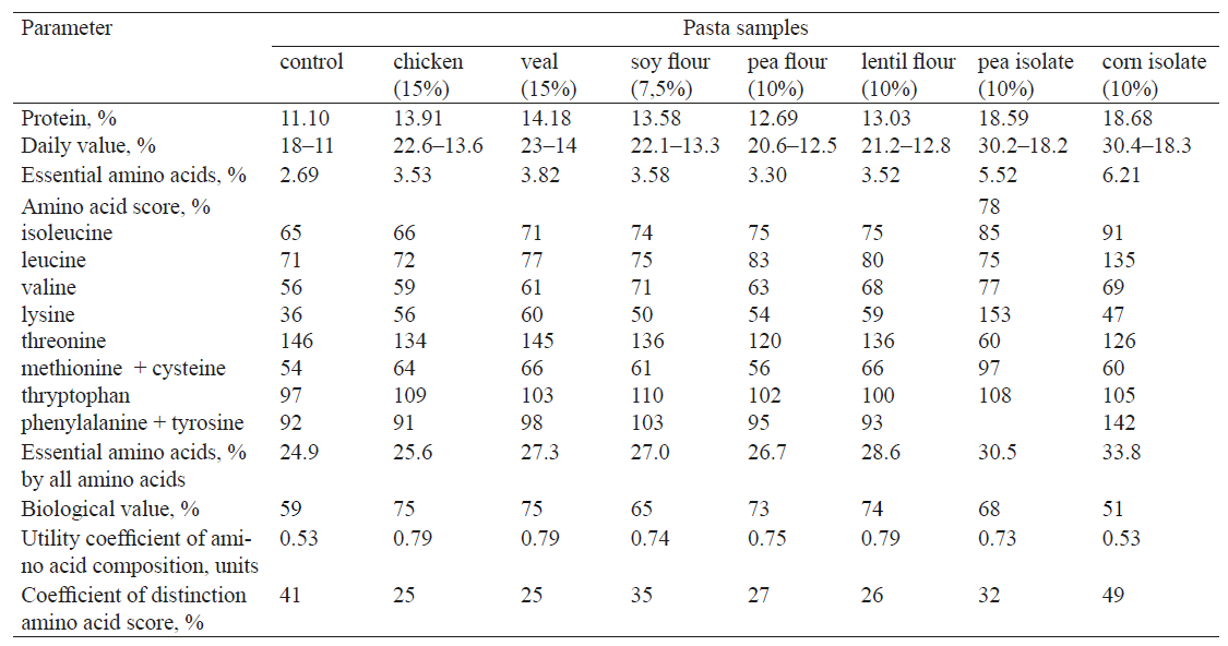 The present work includes results on enrichment of pasta, a mass-consumption product, with protein. Meat products, legume (Leguminosae L.) flour and plant protein isolates were used as protein-containing additives. The content of protein and essential amino acids in the additives makes them promising for improving the biological value of pasta. We studied effects of the additives on raw gluten and wheat flour starch properties, pasta dough rheological characteristics, and finished product quality. As a result, the following optimal amounts of the additives were established: 15% by weight of flour for meat, 10% by weight of the mixture for pea and lentil flour as well as plant isolates, and 7.5% by weight of the mixture for soy flour. The enriching components added in pasta dough were found to have a positive effect on pasta quality. These increased protein content by 1.59–8.19%, biological value by 6–16%, utility coefficient of amino acid composition by 0.2–0.26, protein digestibility by pepsin by 11–24%, and daily protein intake level by 31.4–12.5%.