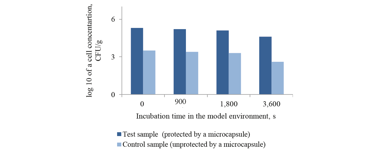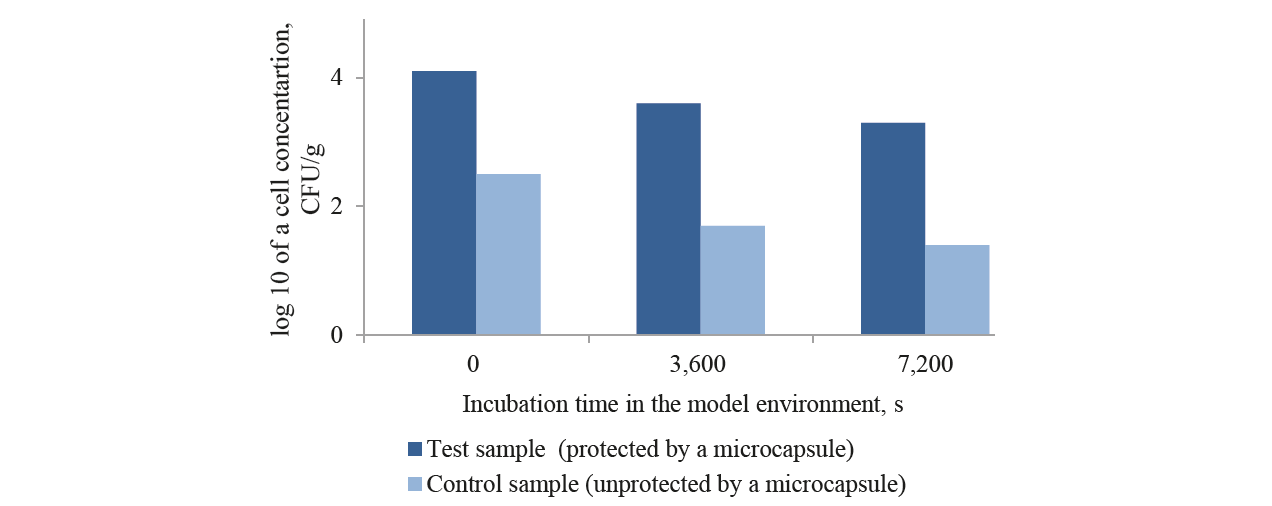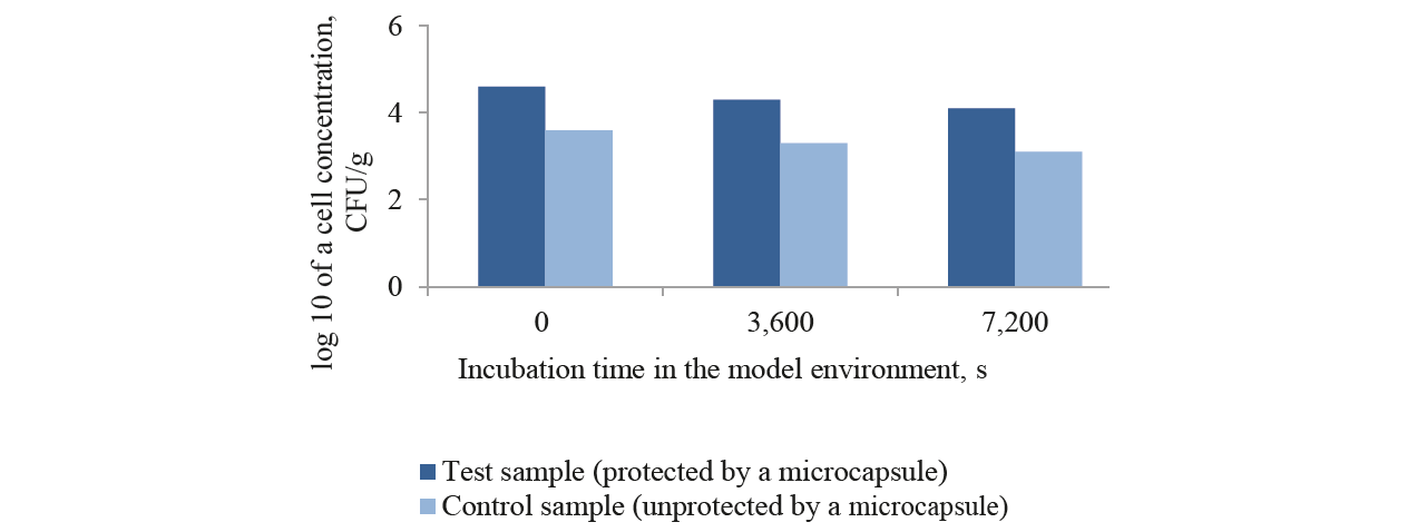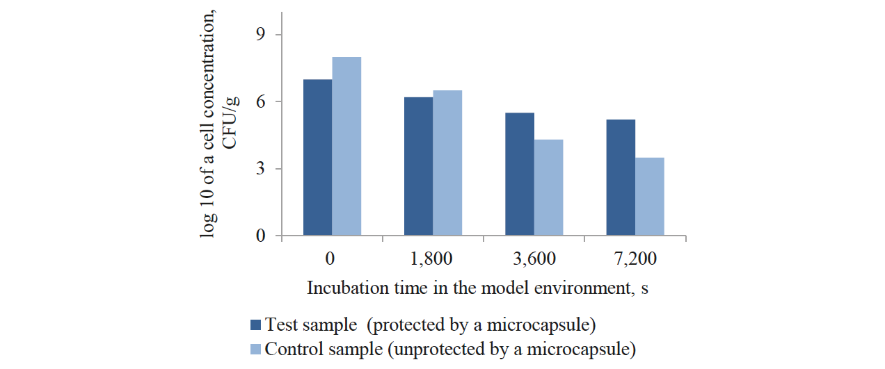 The present research features a natural polymer that can be used for immobilisation of bifidobacteria as well as a method of immobilisation. We described a modified method of microencapsulation of probiotics using sodi- um alginate. The experiment studied the effect of encapsulation on probiotic stability and involved an in vitro model of human digestive tract. The test sample of microencapsulated Bifidobacterium bifidum 791 showed a decrease in the activity from 3.0×107 to 2.2×105 CFU/ml in a mouse model with pH 1.2. By contrast, the control sample, unprotected by biodegradable polymer microcapsules, demonstrated a higher death rate of bifidobacteria: from 2.6×108 CFU/ml to 5.0×103 CFU/ml. The control sample demonstrated the same downward trend in in vitro gastrointestinal models with pH values of 4.5, 6.8, 7.2, and 5.8. Because the total plate count fell down to 4.0l g CFU/ml in acidity gradients, the titres of the initial microencapsulated biomass had to be increased up to > 109 CFU/ml. According to the results of scanning electron microscopy, the new type of microcapsules obtained by using a resistant starch had a closed sur- face. Prebiotics increased the resistance of bacteria to low pH and bile salts. Bifidobacteria encapsulated with natural biodegradable polymers proved to be well-tolerated and harmless for mice. The experiment revealed that biodegrad- able polymer microcapsules did not cause any chronic or acute toxicity when administered orally at 2×107 CFU per 1 gram of animal mass. The microcapsules demonstrated neither dermonecrotic properties nor any irritant effect on the ocular mucosa and, thus, can be used for food enforcement.