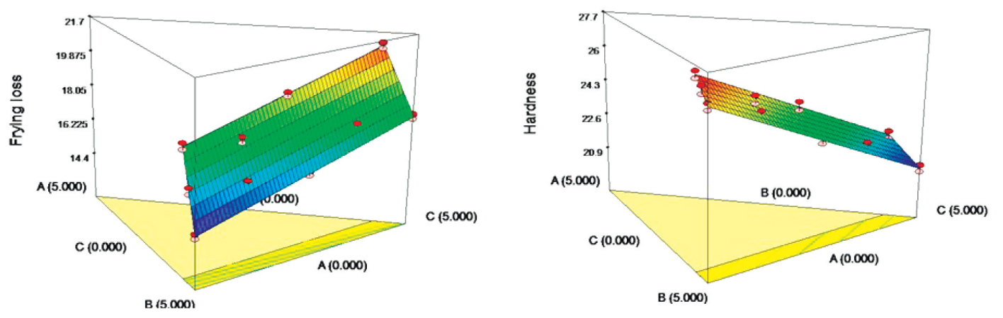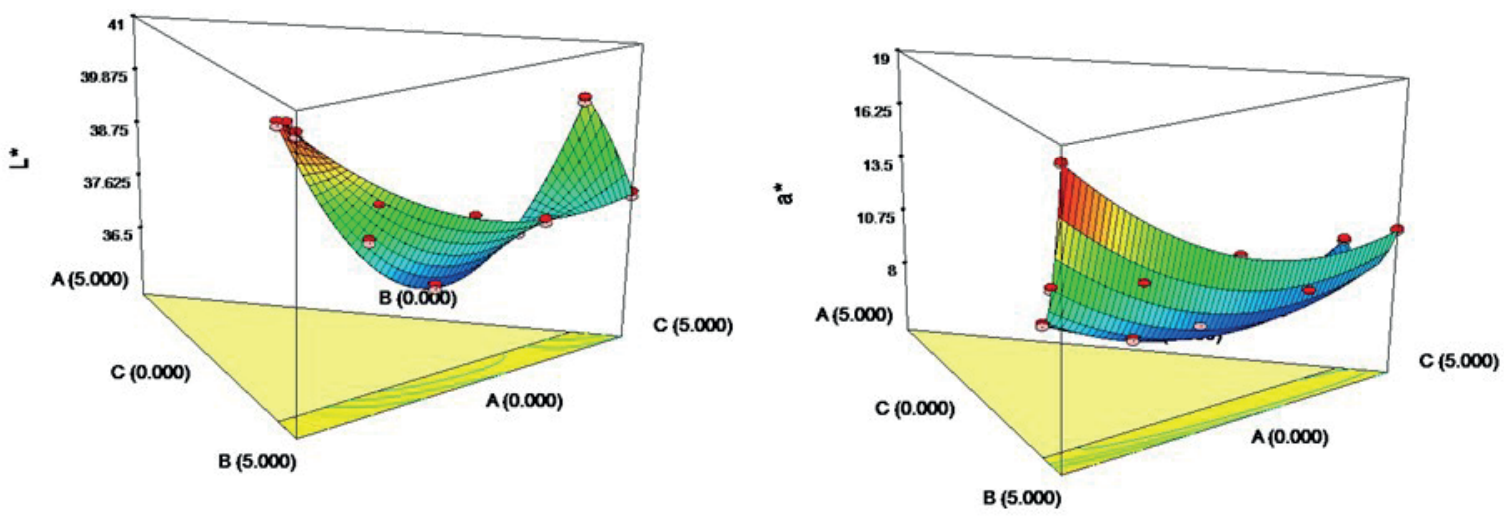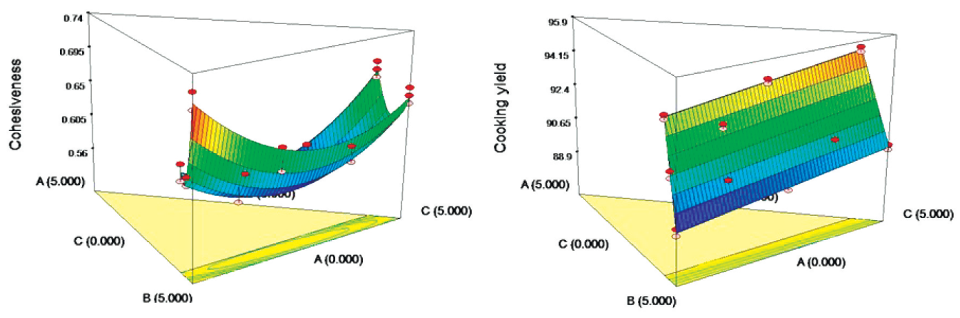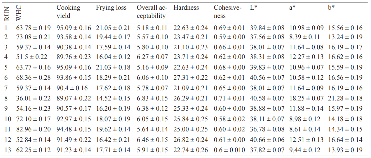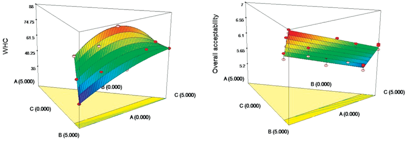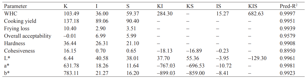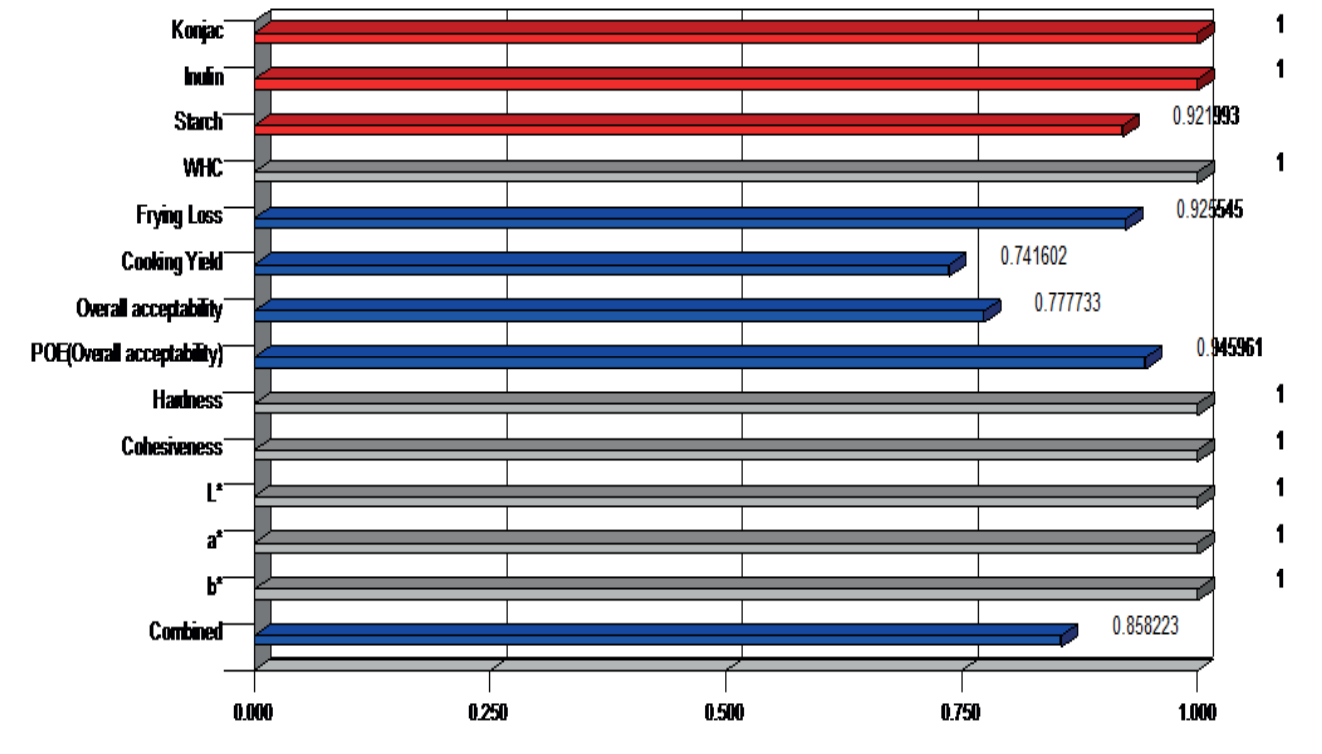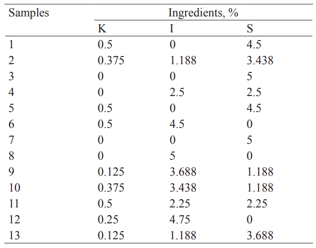 In this study, we applied the D-optimal mixture design method to optimise prebiotic sausage formulation with inulin, konjac (Amorphophallus konjac L.), and starch. Also, we investigated the effect of each component indi- vidually as well as their mixtures on cooking characteristics, texture, colour and sensory properties of prebiotic sau- sages. The results of this study revealed that the increase in inulin content in the formulations of sausages led to lower frying loss, and increased water holding capacity (WHC), lightness, and overall acceptability. The incorporation of konjac increased the cooking yield, hardness, cohesiveness, redness, and yellowness. On the other hand, konjac added into the sausage formulation decreased overall acceptability. The mixtures of inulin, konjac, and starch improved the cooking characteristics and overall acceptability of the sausages without significant negative effect on the color or sensory properties. The results of the study clarified that the optimum amounts of inulin, starch, and konjac were 2.09; 2.76; and 0.146 %, respectively. The obtained results make it possible to use the combination of these components to produce prebiotic sausage.