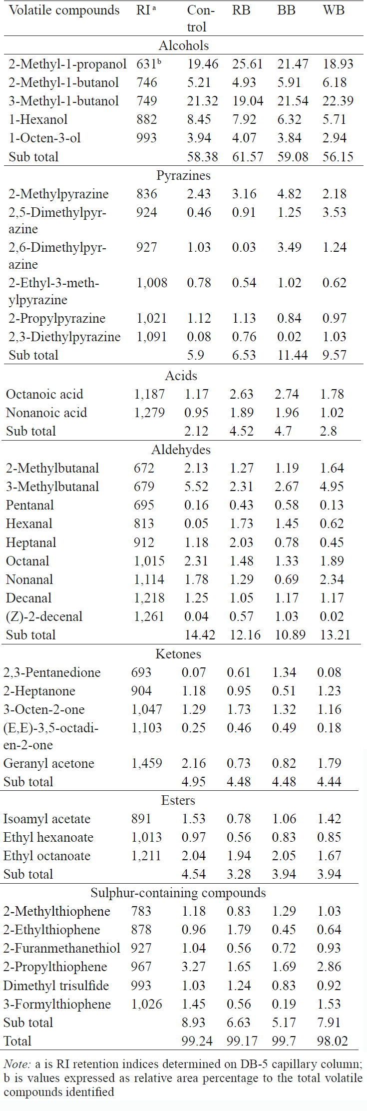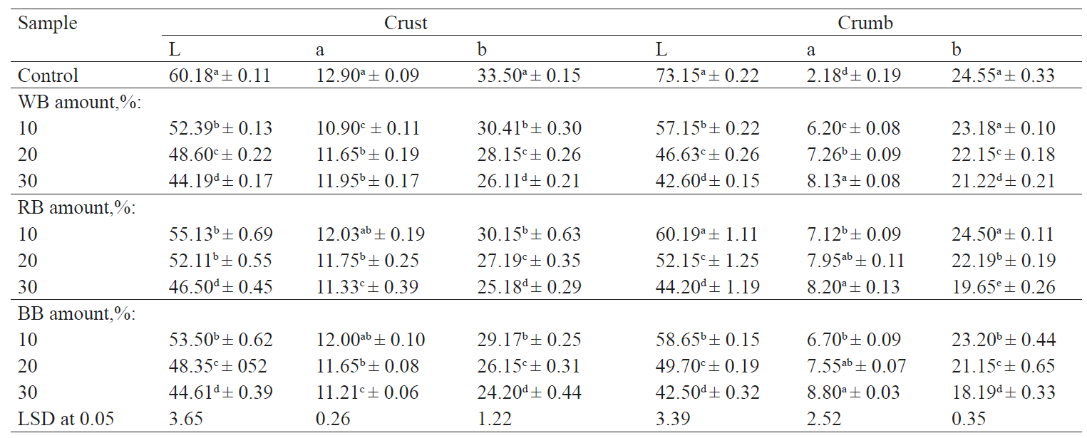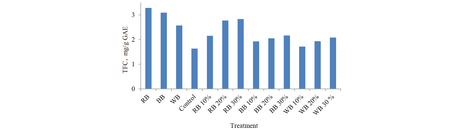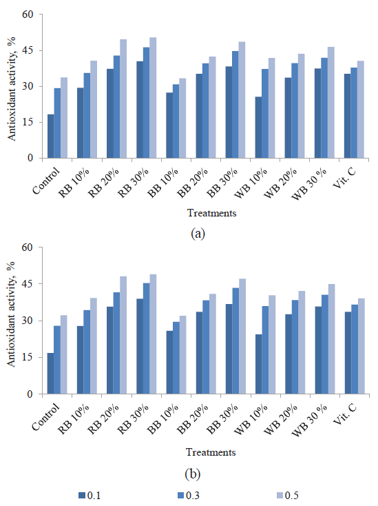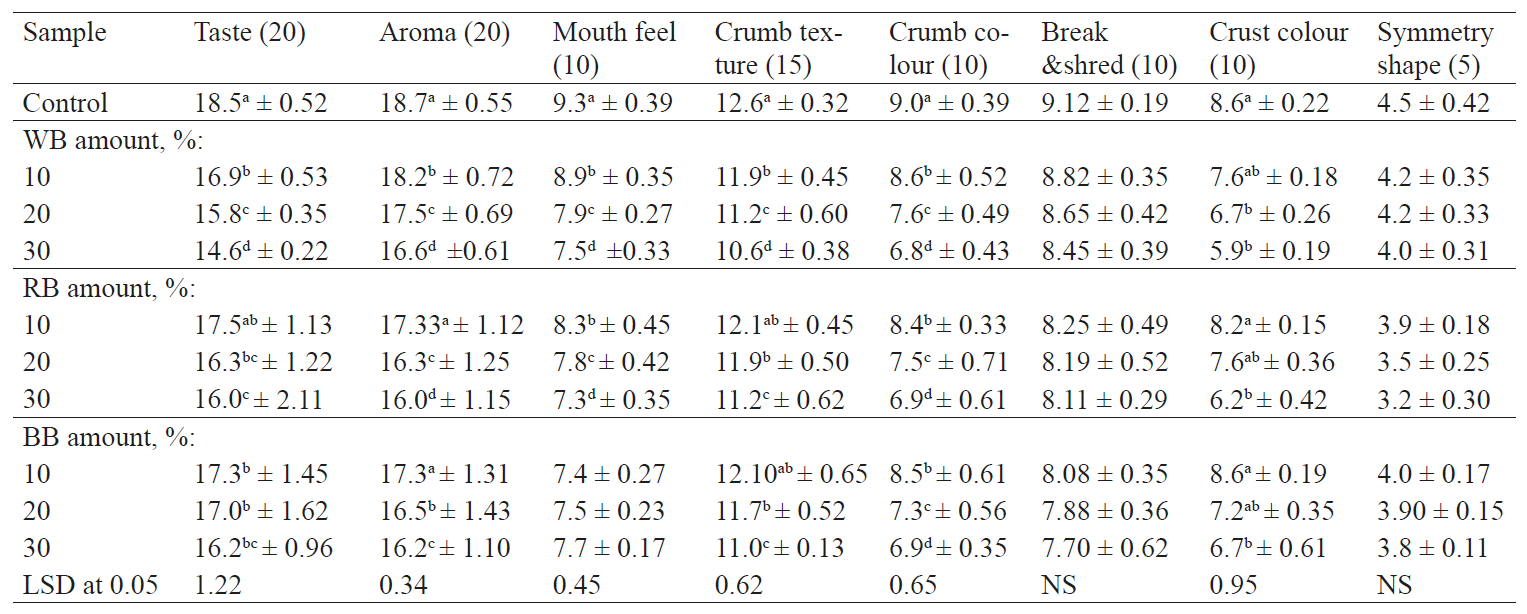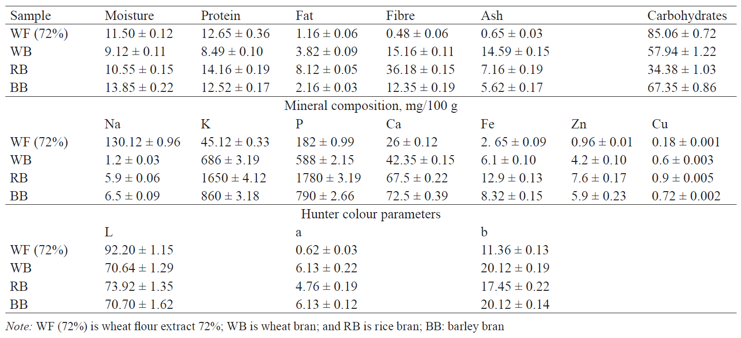 The present study aimed to evaluate the effect of various bran sources, including wheat, barley, and rice, on the quality and volatile compounds of Egyptian ‘balady’ bread (Fino). The protein, fat, and total carbohydrates content of the studied brans ranged from 8.49 to 14.16%, 2.16 to 8.12%, and 34.38 to 85.06%, respectively. The mi- neral composition and colour parameters of the brans were also evaluated. The substitution of wheat flour with 10%, 20%, and 30% of different brans resulted in decreased loaf volume and specific volume, and increased loaf weight. A significant decrease in colour parameters (L, a, and b) of the bread crust and crumb were observed in all the sam- ples. The addition of bran at three concentrations showed a remarkable increase in the total phenolic content of the bread samples, compared to the control. The antioxidant activity of the bread samples fortified with brans showed the following order: RB (rice bran) > BB (barley bran) > WB (wheat bran), as determined by the DPPH and β-carotene assays. Thirty-six volatile compounds identified in the bread samples using GC-MS included 5 alcohols, 6 pyrazines, 2 acids, 9 aldehydes, 5 ketones, 3 esters, and 6 sulphur-containing compounds. Alcohols were the predominant volatile constituents accounting for 58.3; 61.57; 59.08; and 56.15% in the control and in the bread samples prepared with bran from rice, barley, and wheat, respectively.