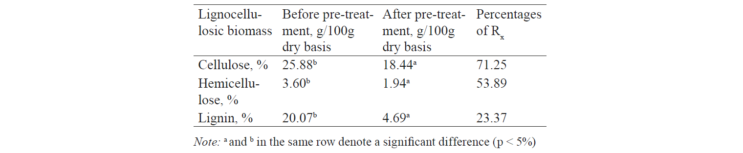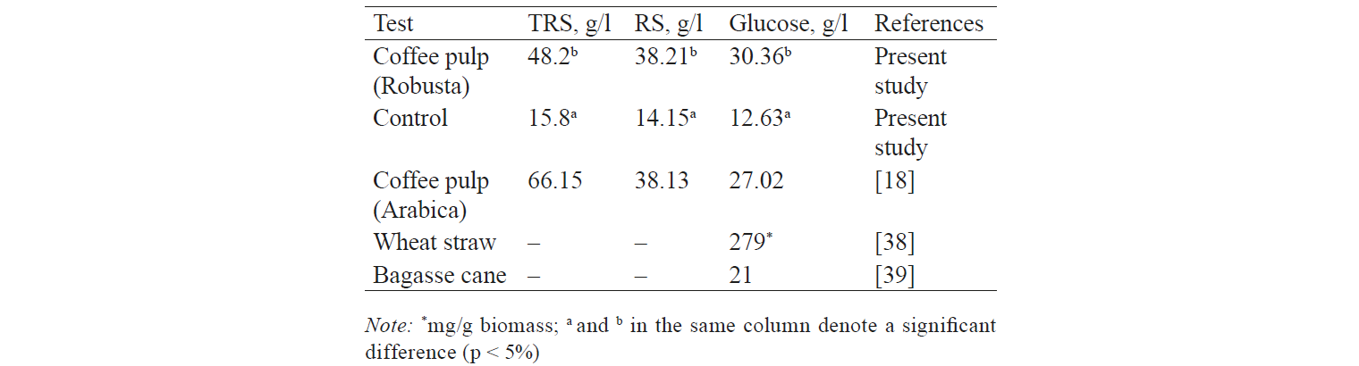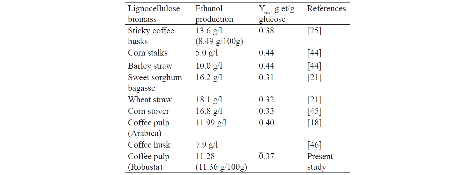 Coffee pulp is the first waste product obtained during the wet processing of coffee beans. Coffee pulp makes up nearly 40% of the total weight of the coffee cherry. Coffee pulp contains 25.88% of cellulose, 3.6% of hemicel- luloses, and 20.07% of lignin. Coffee pulp is considered as an ideal substrate of lignocellulose biomass for micro- bial fermentation to produce such value-added products as ethanol. In this study, we used alkaline pre-treatment of the coffee pulp with NaOH (0.2 g/g biomass) in a microwave system at 120°C during 20 min. This method gave the best results: 71.25% of cellulose remained, and 46.11% of hemicellulose and 76.63% of lignin were removed. After that, the pre-treated biomass was hydrolyzed by Viscozyme Cassava C (enzyme loading was 19.27 FPU/g) at 50°C for 72 hours. The results showed that the highest reducing sugars and glucose concentration after hydrolysis were 38.21 g/l and 30.36 g/l, respectively. Then, the hydrolysis solution was fermented by S. cerevisiae (3.108 cells/ml) at 30°C for 72 hours. The highest concentration of ethanol obtained was 11.28 g/l. The result illustrated that, available and non- edible as it is, coffee pulp could be a potential feedstock for bioethanol production in Vietnam.