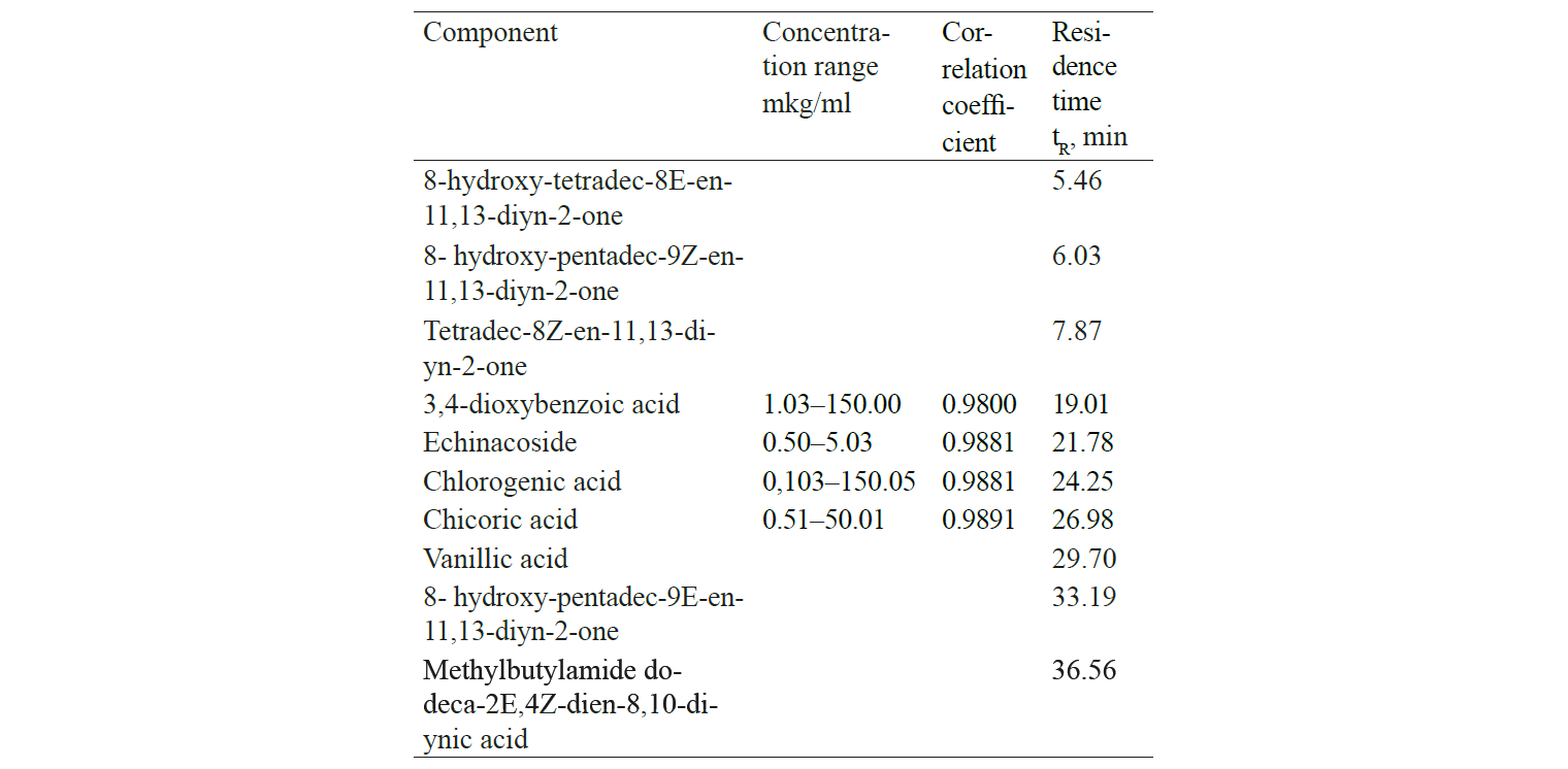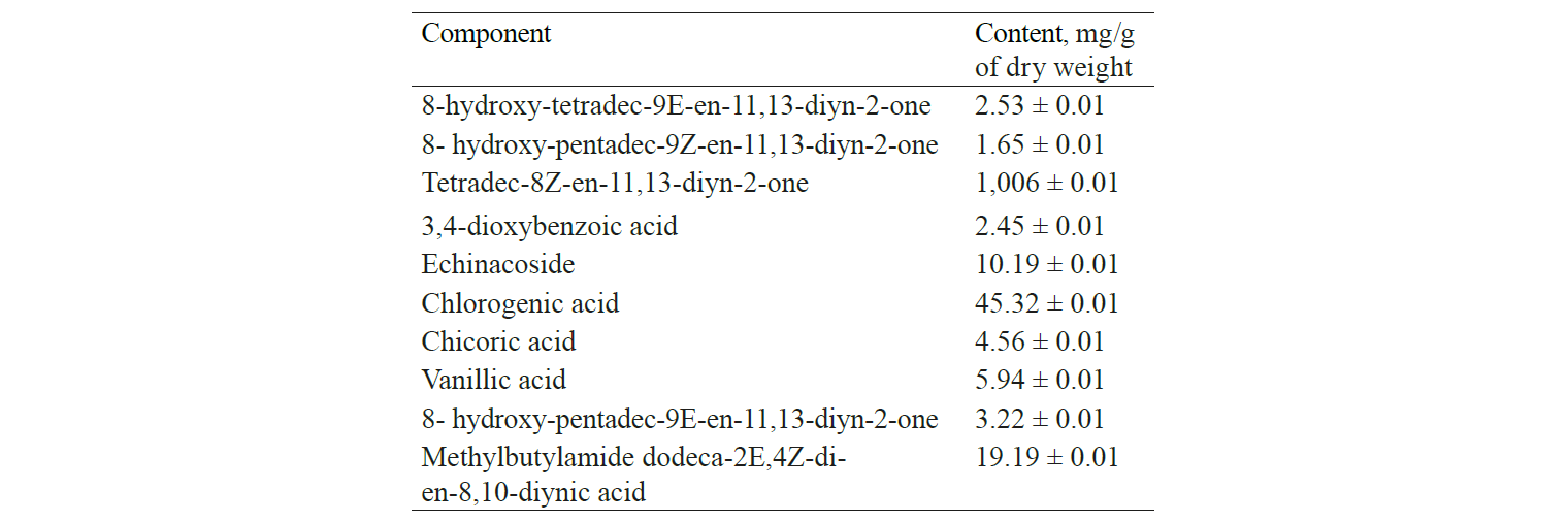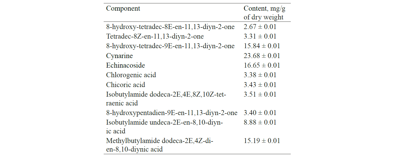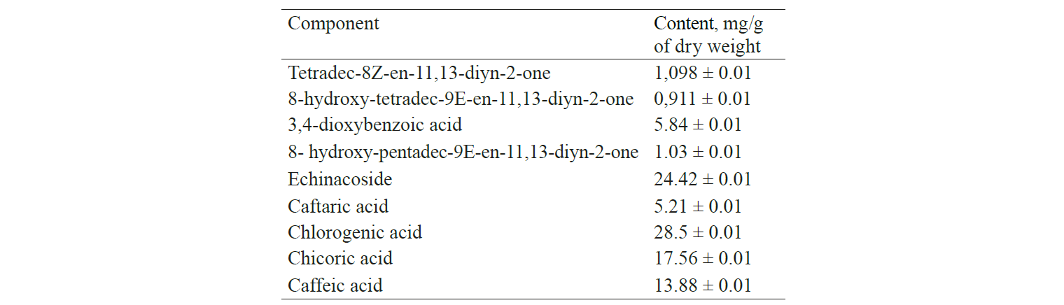 Immunodeficiency causes a lot of modern diseases. Immunodeficiency, in its turn, is caused by such factors as polluted environment, chronic stress, sedentary lifestyle, unbalanced diet, etc. All these factors weaken respi- ratory organs and gastrointestinal tract, disturb hormonal regulation, and destabilize immune defence. Food industry responds to these challenges by developing functional foods and dietary supplements from medicinal plants. Dietary supplements made from natural plant extracts have more advantages than their numerous synthetic analogues. They produce a mild therapeutic effect and no pronounced side effects. Purple Echinacea (Echinacea purpurea L.) possesses immunomodulatory, anti-inflammatory, antiviral, and tonic properties. However, climatic and soil conditions are known to affect the qualitative and quantitative profile of biologically active substances. The present paper describes the micronutrient profile of various parts of Echinacea purpurea grown in the Kemerovo region. The study employed a complex of physical and chemical methods. The research featured leaves, roots, and flowers, as well as components extracted from the plant with the help of a 70% ethanol solution. The latter was chosen for its universal properties in micronutrient extraction. The methods included high performance liquid chromatography (HPLC), thin layer chromatography (TLC), and IR spectroscopy. A set of triple experiments showed that the extracts contained substances with anti-inflammatory, antioxidant, and immunomodulating properties. Thus, Echinacea extract can be recommended for functional foods and dietary supplements.