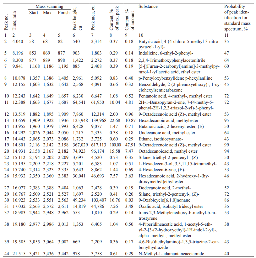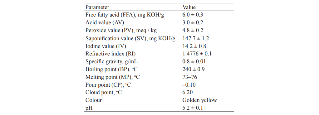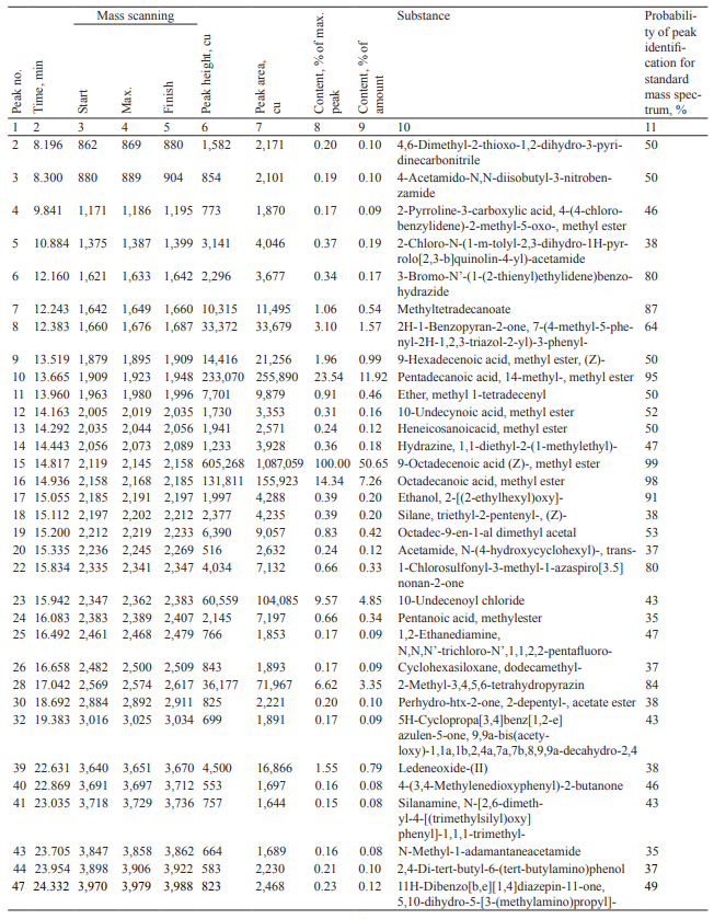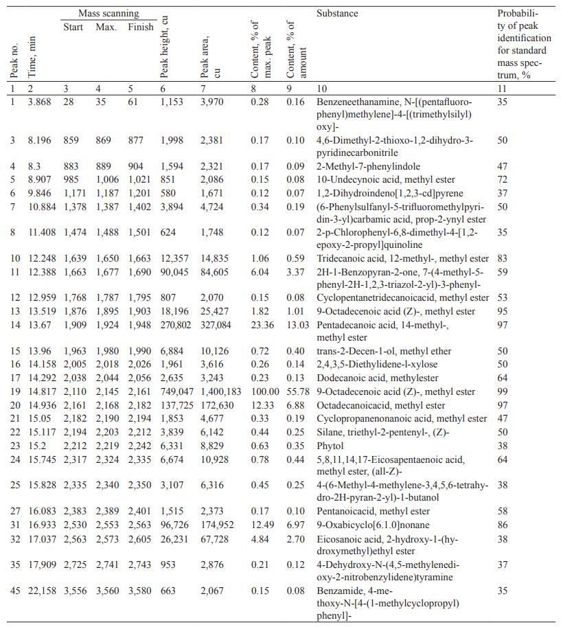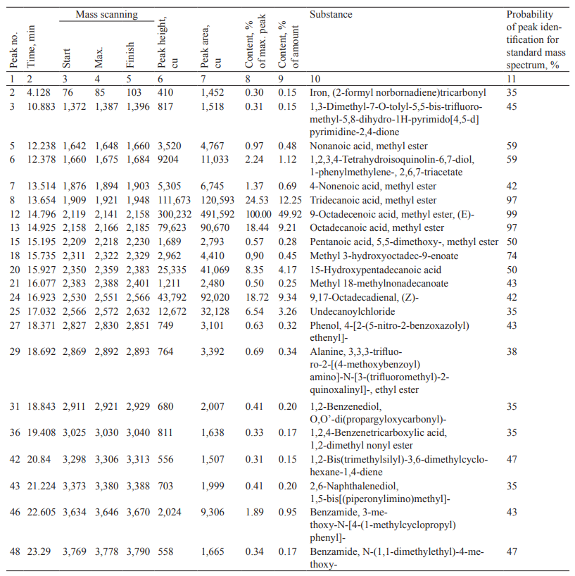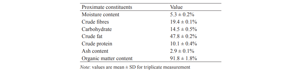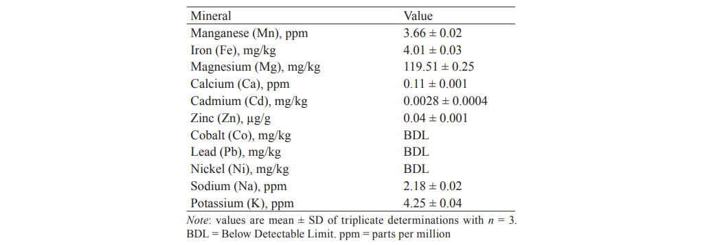 The aim of this research was to assess the nutraceutical potential of Hura crepitans seed oil in food chemistry. For that, we determined the phytochemical composition, physicochemical parameters, mineral composition, as well as proximates of the oil under study. The yield of the oil obtained by the Soxhlet method was 47.8 ± 0.2%. According to the phytochemical screening result, the oil contained saponin, alkaloid, terpenoids, steroids, and cardenolides. Quantitative analysis of proximates for the Hura crepitans seed oil displayed 10.1 ± 0.4% of protein, 19.4 ± 0.1% of crude fibres, 14.5 ± 0.5% of carbohydrates, 5.3 ± 0.2% of water, and 2.9 ± 0.1% of ash. Some selected physicochemical parameters such as refractive index, pH, and specific gravity were 1.47; 5.2; and 0.80, respectively. Cloud point was 6.20°C. Metal content determination revealed the presence of mineral substances such as magnesium (119.51 ± 0.25 mg/kg), potassium (4.25 ± 0.04 ppm), iron (4.01 ± 0.03 mg/kg), manganese (3.66 ± 0.02 ppm), sodium (2.18 ± 0.02 ppm), calcium (0.11 ± 0.001 ppm), zinc (0.04 ± 0.001 µg/g), and cadmium (0.0028 ± 0.0004 mg/kg). However, such minerals as nickel and lead were not detected. The structural analyse was carried out based on physicochemical properties and spectroscopic data of the Hura crepitans seed oil. The results of the research proved the nutraceutical potential of this oil to use as raw materials in various areas of industry.
