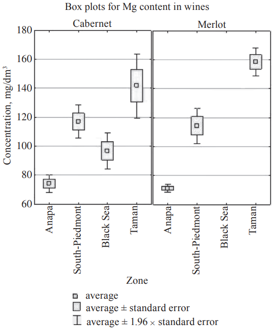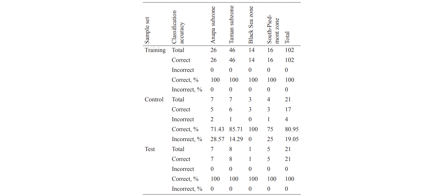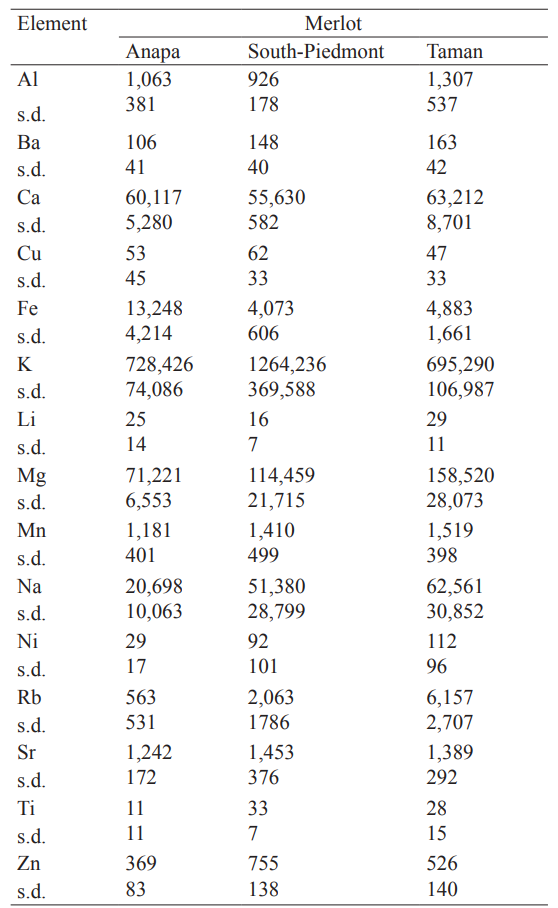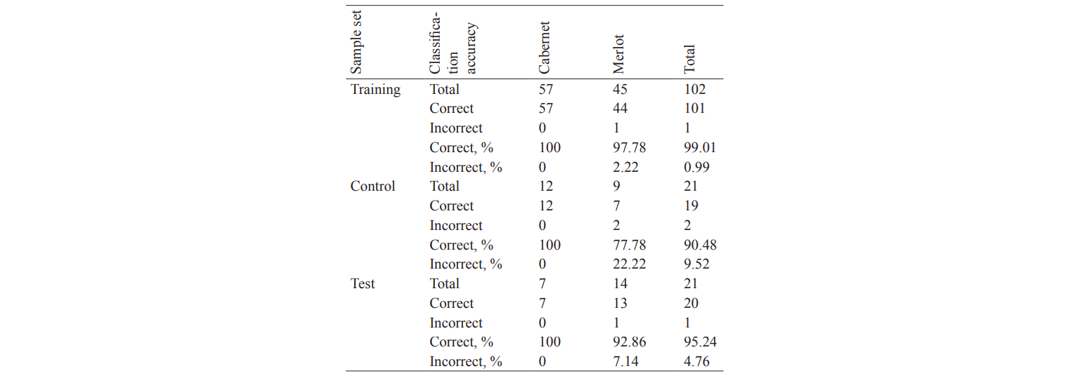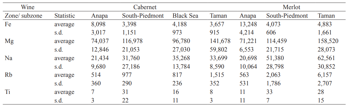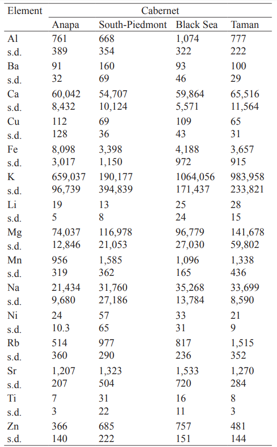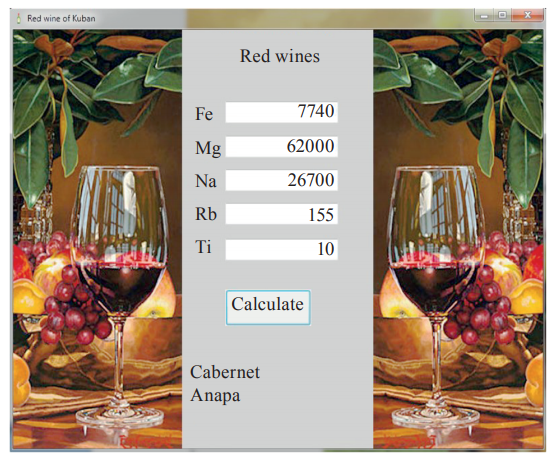 This paper shows a possibility of establishing the authenticity and geographic origin of wines by neural networks based on multi-element analysis. The study used 144 samples of Cabernet and Merlot dry red wines produced in Krasnodar Region according to traditional technologies. The wines were provided by the producers or purchased in retail stores. The concentrations of 20 micro- and macroelements in red wines were determined by atomic emission spectroscopy with inductively coupled plasma. The analysis of average elemental contents showed a significant dependence of wine composition on the grape variety and place of origin, which enabled us to examine interrelations between the elements and think of a way to identify them by means of classification models. The software STATISTICA Neural Networks was used to assess a possibility of determining the grape variety and geographical origin. The neural networks constructed in the study contained five variables corresponding to the elements with statistically significant correlations between the names of the regions and the wine samples, namely Fe, Mg, Rb, Ti, and Na. These predictors were able to determine the grape variety and place of growth with a sufficiently high accuracy. In the test sample set, the accuracy reached 95.24% and 100% for variety and region identification, respectively. A software product was developed to automate the calculations based on the neural networks. The program can establish the grape variety from a minimal set of microelements, and then, based on the variety and the same set of microelements, determine its place of origin.