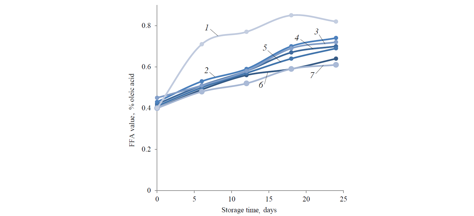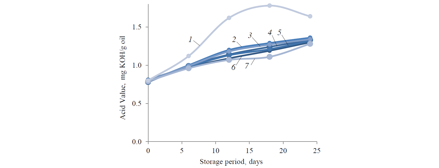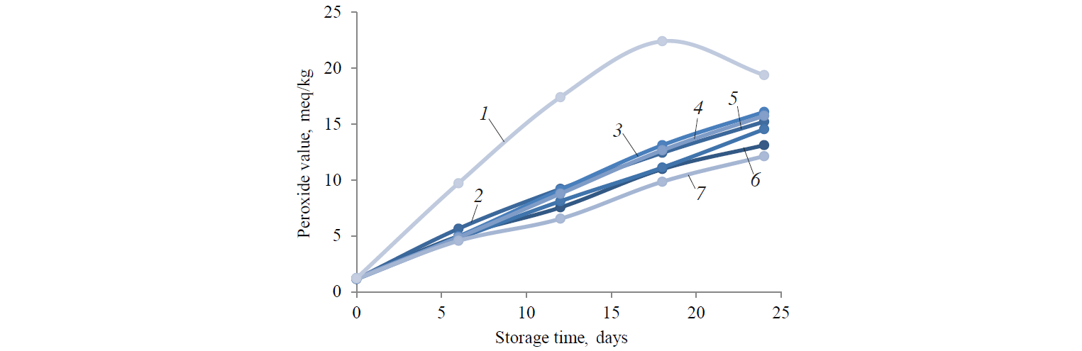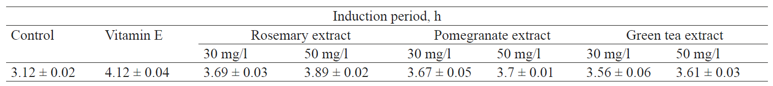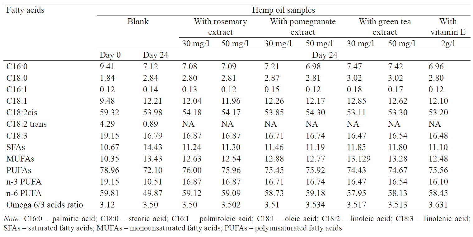 The present research features such natural herbal extracts as rosemary (Rosmarinus officinalis L.), pomegranate (Punica granatum L.), and green tea (Camellia sinensis L.). Together with vitamin E, they were chosen to investigate hemp oil stability. The experiments revealed the effect of various fatty acids compositions on hemp oil properties. The effect of herbal extracts on the oxidative stability of oils was measured using the Rancimat method. The chemical tests included peroxide value (PV), free fatty acid (FFA) value, and acidity value (AV). Each herbal extract was applied in amounts of 30 mg/l and 50 mg/l. Vitamin E was mixed with the oil in the amount of 2 g/l. The changes in PV, FFA, AV, and fatty acid composition were measured on day 6, 12, 18, and 24. Hemp oil, pure or mixed with the extracts, was analyzed using the Rancimat method at 120°C with an airflow rate of 20 l/h to identify the in- duction periods (IP). IP values of oils with additional herbal extracts were found to be significantly higher (p < 0.05) than those of the control samples. The oil sample with vitamin E demonstrated the longest IP (4.12 hours at 120°C) during the Rancimat test. The herbal extracts and vitamin E had a positive effect on hemp oil PV compared with the control sample. Gas chromatography (GC) showed that hemp oil included a high amount of polyunsaturated Ome- ga-3 fatty acids, and the oil was not resistant to oxidation. In general, the natural herbal extracts and vitamin E in the recommended quantities had a positive effect on the oxidative stability of hemp oil.