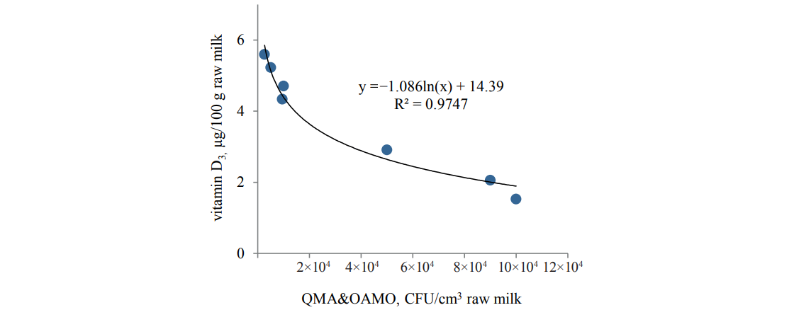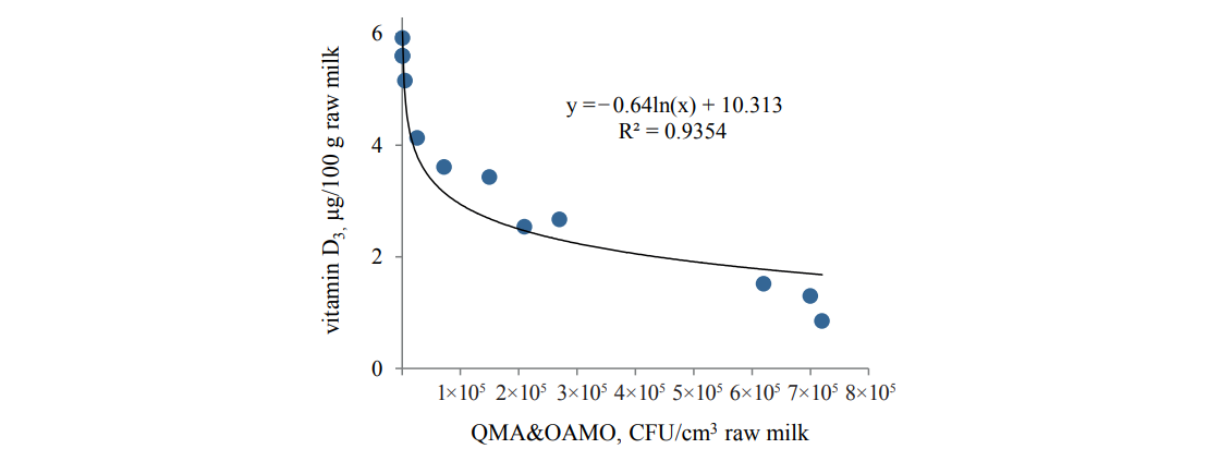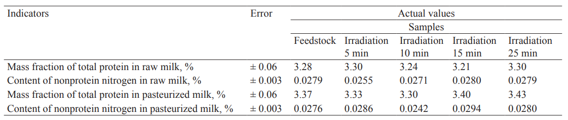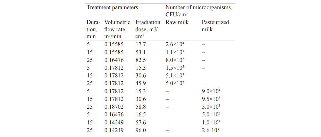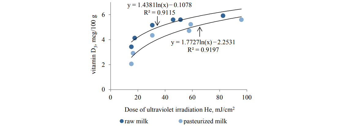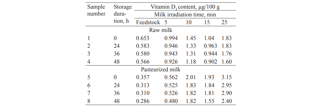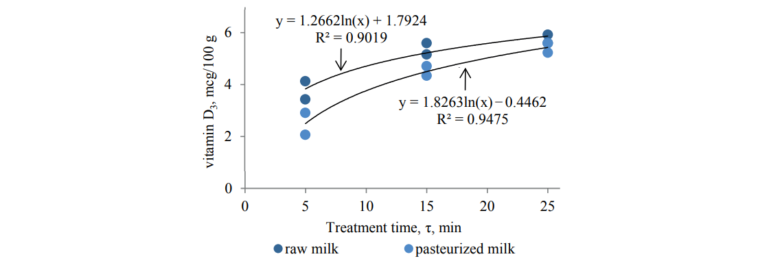 The use of ultraviolet radiation in the treatment of milk and other liquid foods is a very promising field of study since it reduces their bacterial load. It is rarely used to increase the vitamin D3 content and modify the protein and fatty acid composition of milk. The paper describes how different parameters of ultraviolet radiation influence such characteristics of raw and pasteurized milk as the mass fraction of total protein, nonprotein nitrogen content, active and titratable acidity, general bacterial load (QMA&OAMO), fatty acid composition, and vitamin D3 content. Low-pressure gas-discharge lamps were used to treat a 400 µm moving layer of milk with ultraviolet radiation. The radiation time, its doses, and the milk flow rate changed in the ranges of 5–25 min, 5.1–102 mJ/cm2, and 0.04453- 0.13359 m3/s, respectively. We identified optimal radiation ranges that lead to both a lower microorganism content and a higher vitamin D3 content. Our study also determined specific correlations in the mutual changes of the given parameters. The treatment ranges did not produce any significant changes in other physico-chemical properties of milk. We also found that vitamin D3 was synthesized in raw and pasteurized milk in a similar way. Moreover, there was an insignificant decrease in the vitamin D3 content in milk treated with ultraviolet radiation during storage for up to 48 hours. On the whole, the results indicate that the treatment of milk with ultraviolet radiation in the dosage range from 5.1 to 102 mJ/cm2 has a complex effect on the total bacterial load (QMA&OAMO) and vitamin D3 content, whereas it has almost no effect on the protein and fatty acid composition.