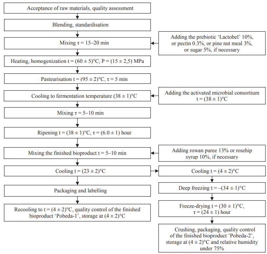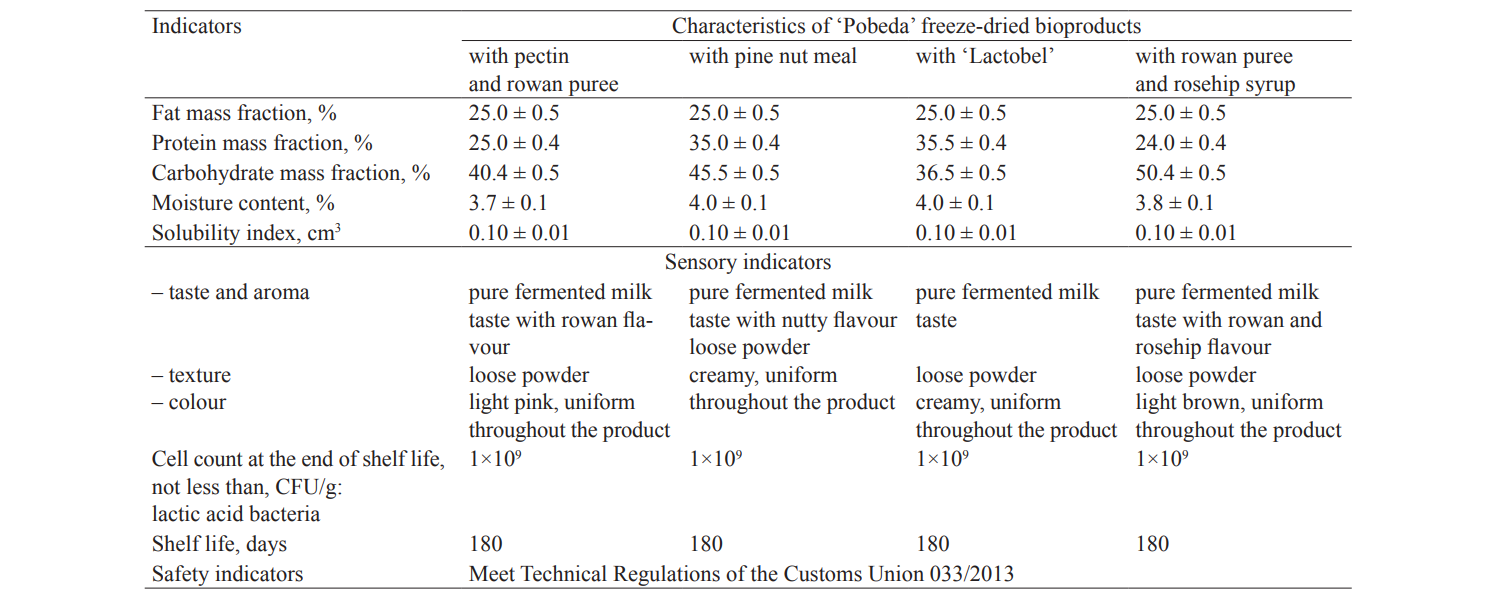 The Arctic is currently a strategic region of Russia and it requires military protection. Good nutrition is a prerequisite for successful performance of the servicemen in such extreme conditions. The Russian armed forces do not have a special ration for the Arctic region. The existing rations lack products enriched with biologically active substances, probiotics, prebiotics, or vitamin and mineral complexes. Subcaloric nutrition, even with short-term physical exertion, in combination with low temperatures deprives the human body of vitamins and minerals. Therefore, the development of freeze-dried bioproducts with functional properties is highly relevant. This article presents the results of a study aimed to develop new freeze-dried milk-based bioproducts for the Russian military in the Arctic. For this, we created a microbial consortium of lactic acid bacteria with a wide spectrum of antimicrobial activity. We also used a range of functional ingredients, namely pectin, pine nut meal, a ‘Lactobel’ prebiotic protein-and-carbohydrate product, rowan puree, and rosehip syrup in the amounts established during the study. The new freeze-dried milk-based bioproducts named ‘Pobeda’, enriched with combiotics and metabiotics, will provide the Russian military with better nutrition in the extreme conditions of the Arctic.