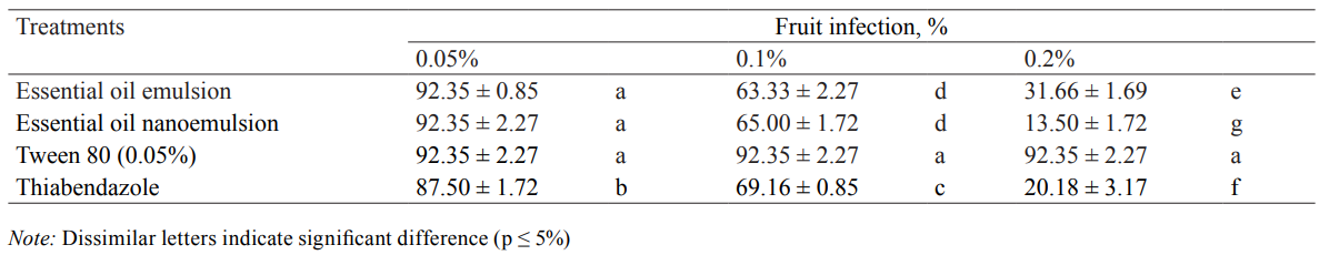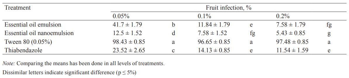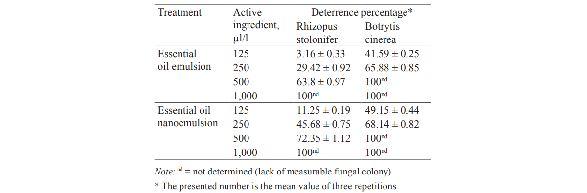 Application of essential oils in controlling plant pathogens is generally associated with difficulty due to low solubility in water, strong odor, physical and chemical instability. One of the ways to minimise these effects is to use a nanoemulsion system. It also increases the antimicrobial properties. In this research, after preparation of cinnamon (Cinnamon zeylanicum L.) essential oil (CEO), nanoemulsion of the essential oil was prepared and its physical and chemical properties were determined. The particle size of nanoemulsion was determined to be 115.33 ± 3.97 nm. Emulsification and nanoemulsion of the essential oil along with thiabendazole as an antifungal agent at various concentrations of active ingredient were studied for control of Rhizopus stolonifera and Botrytis cinerea fungi, strawberry fruit decay. Results in solid Potato Dextrose Agar (PDA) medium indicated that emulsion and nanoemulsion of CEO have a significant difference in antifungal activity against B. cinerea and R. stolonifera. The minimum inhibitory concentration was 500 and 1,000 μl fungi per liter of culture medium. According to the results of the research, essential oil nanoemulsion had a significant effect on the reduction of a fungal cartilage of strawberry fruit. In general, nano-emulsions of the essential oil showed more antifungal activity than essential oil. There was no significant difference in decay control between thiabendazole and CEO. The nano-emulsion of cinnamon oil at a concentration of 0.2% proved significant effect in reducing fruit decay and showed the lowest fruit infec tion (5.43%). Consequently, nano-emulsion of essential oil is recommended for the production of natural fungicides.