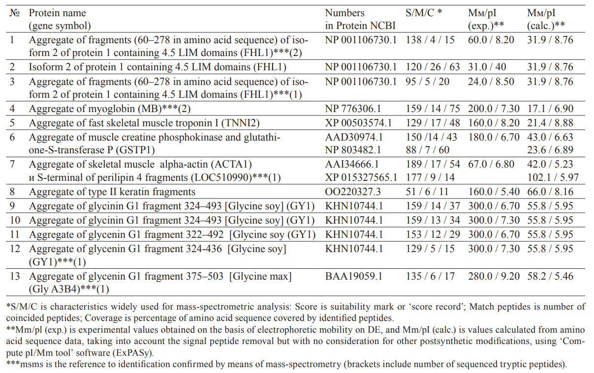 The effect of animal and plant proteases as well as starters, or starter cultures, on protein aggregates for- mation in raw pork and beef as well as meat products was studied. The proteomic analysis of raw meat revealed that animal proteases – pepsin and trypsin – caused the aggregation of isoform 2 of protein 1 containing 4.5 LIM domains. Vacuum packaged meat showed the same results during storage, while unpacking led to the acceleration of the aggregation process due to autolysis. In addition, mixed aggregated fragments, such as muscle creatine phos- phokinase and glutathione-S-transferase, actin and perilipin, and type II keratin appeared in those samples. Starters with Pediococcus pentosaceus 31 from the Russian National Collection of Industrial Microorganisms (VKPM-8901) caused myoglobin and troponin I aggregation, while the formation of soy proteins aggregates (glycinin G1 and glyci- nin A3B4) was detected in meat products as a result of the autolysis process and the use of cholesterol-lowering star- ters. All in all, proteases which cause protein aggregation may be less effective for raw meat tenderization, whereas the proteins identified may be used as quality biomarkers.