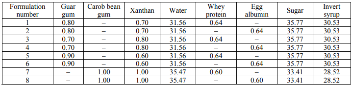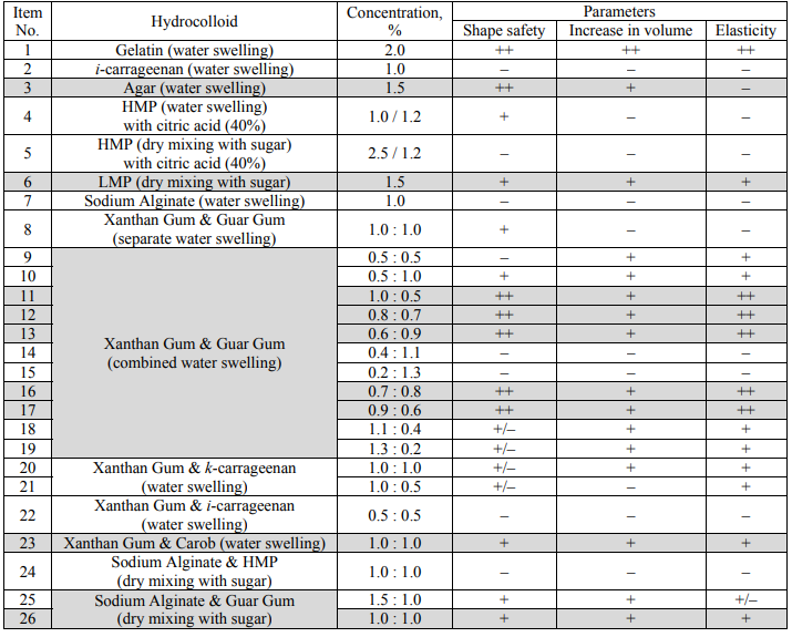 As can be seen from Table 1, those samples have the best texture indicators which are prepared on the basis of agar and low-etherized pectin, the combinations of xanthan gum with guar gum and locust bean gum, and also the combination of sodium alginate and guar gum. The results obtained are in good agreement with the known data on the degree of synergism between hydrocolloids [16, 23]. For further studies, 8 formulations based on xanthan, guar and locust bean gum were selected as the cheapest options, Table 2.