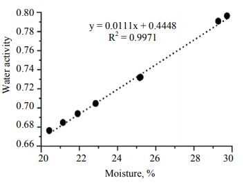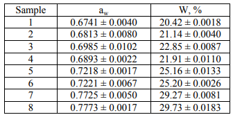 As can be seen from Table 3, all the samples can be referred to a group of food products with intermediate moisture, since the water activity therein is higher than 0.6 and less than 0.9 [17]. At the same time, close correlation between the activity of water and the mass fraction of moisture can be seen from the data (Fig. 1).