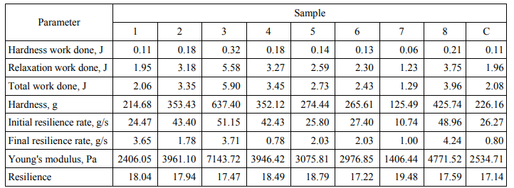 The force needed to chew the product is characterized by its rigidity and is equal to the peak value of the curve. The cohesiveness of the product determines the energy of molecular bonds therein, can be estimated from the energy necessary for product deformation and can geometrically be defined as the sum of the areas formed by the curve and the abscissa before and after reaching the rigidity peak [22]. In this case, the former area characterizes the adhesive force relative to the degree of density of the material being studied, and the inverse relation of the areas is elasticity, i.e., the ability of the product to undergo significant elastic deformations without destruction. More precise information about the elasticity of the product is provided using Young's modulus calculated as the ratio of the pressure on the sample to a change in its linear size during the test. Having constructed tangents to the initial and final points of the section that describes the relaxation time, it is possible to determine the angle of their slope and calculate the corresponding rates at which the sample is reduced. Table 4 presents the study results.