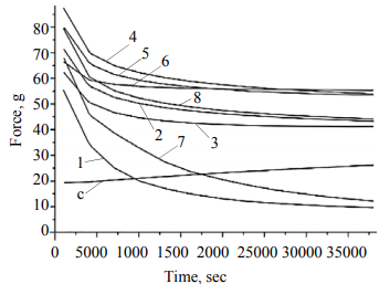 It can be seen from Fig. 3 that the surface tension forces decrease rather significantly over time, moreover, curve 1 decreases below such a low value as 10 mN/m within 35 s, and curve 7 becomes so close to it that brings these systems closer to classical gelatinbased ones. The time dependence is usually explained by the adsorption of one or more surface active components on the surface of the platinum plate hampered by the high viscosity of the system. However, the minimum value of σ is unusual.