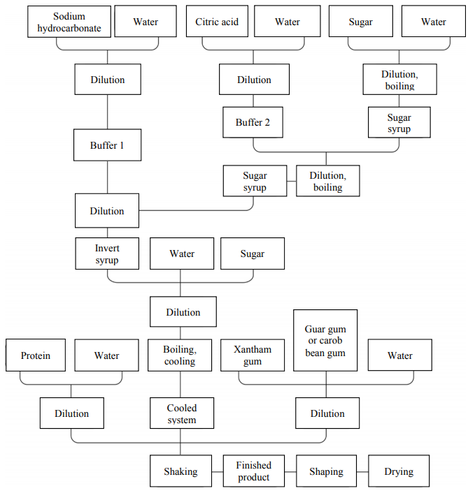 In accordance with the above, the samples with the numbers 3 and 4 are characterized by the highest thickness, relatively clean cuts and the uniform distribution of the air bubbles that are approximately equal in size, which indicates quality texture. The samples with the numbers 1 and 2 are also quite large, they are easy to cut and they are evenly saturated with gas. In contrast to the former two couples, samples 5 through 8 exhibit high adhesion properties and, as can be seen from the figure, are less amenable to aeration. Figure 5 presents a marshmallow preparation flow sheet.